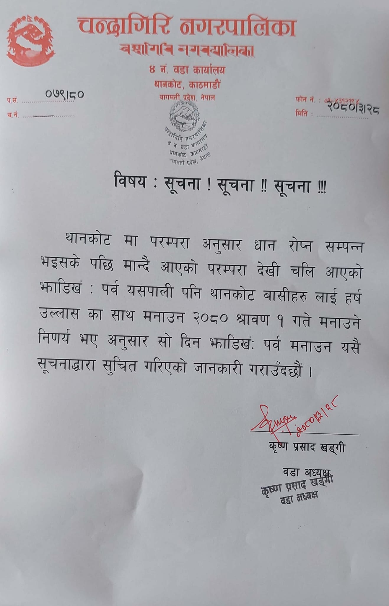 आगामी साउन १ गते सोमबार चन्द्रागिरि नगरपालिका ३ र ४ थानकोटमा झदिखः (रोपाईँ पर्व) मनाइने भएको छ ।