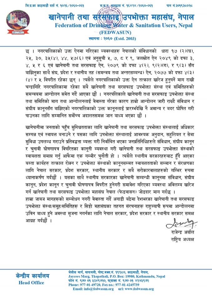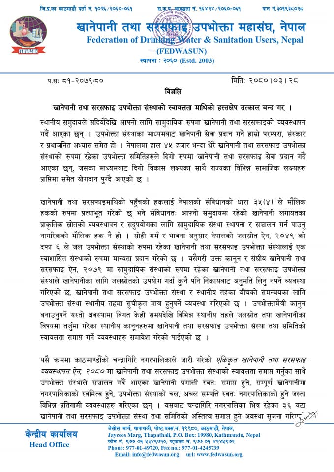‘खानेपानी तथा सरसफाइमाथिको पहुँचको हकलाई नेपालको संविधानले मौलिक हकका रूपमा प्रत्याभूत गरेको छ,’ महासंघले जारी गरेको विज्ञप्तिमा भनिएको छ, ‘आफ्नो समुदायमा रहेका खानेपानीलगायतका प्राकृतिक स्रोतको व्यवस्थापन र सदुयोगका लागि सामुदायिक संस्था स्थापना र सञ्चालन गर्न पाउनु नागरिकको मौलिक अधिकार हो।’