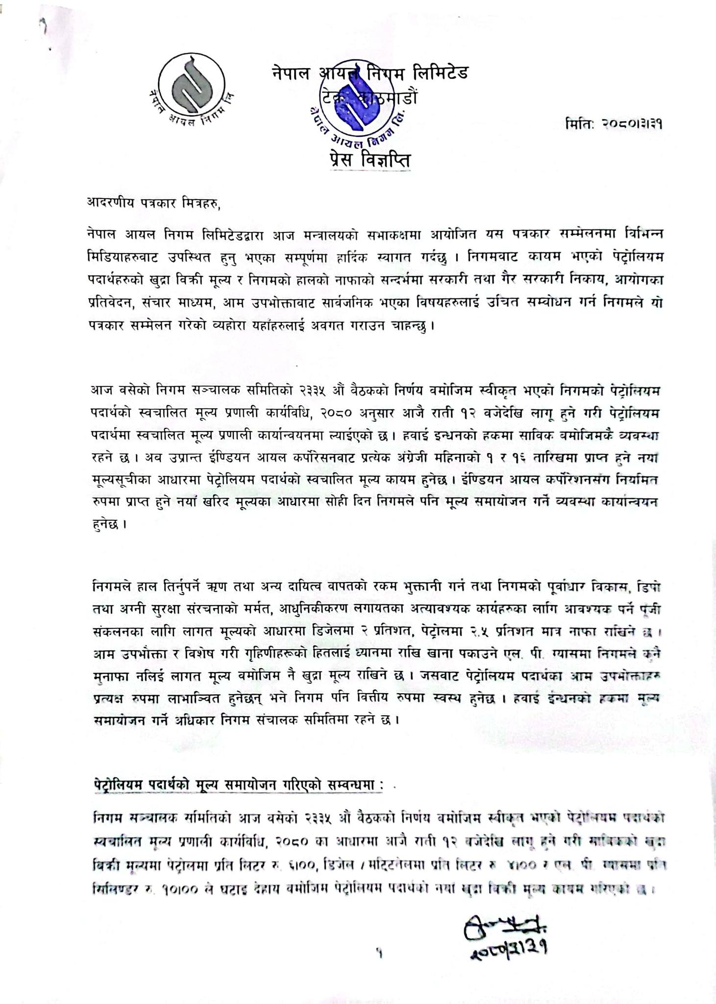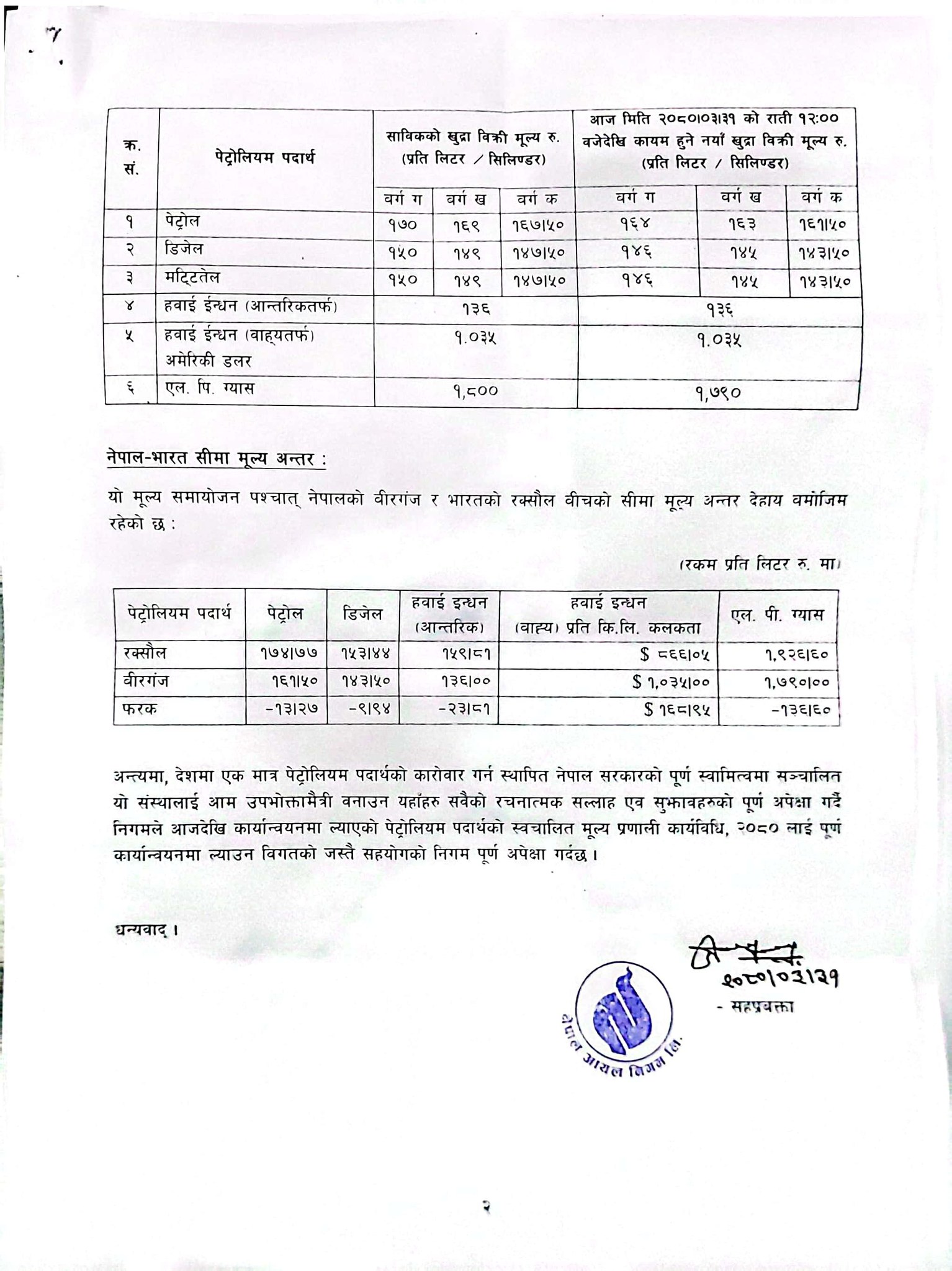 नेपालमा पेट्रोलियम पदार्थको भाउ घटेको छ।