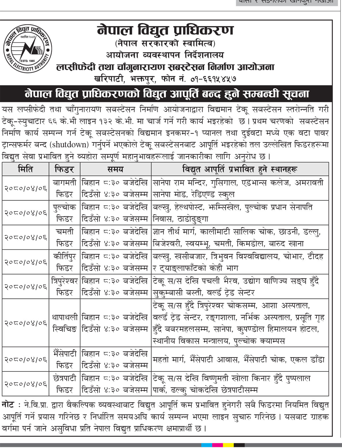 नेपाल विद्युत प्राधिकरणका अनुसार टेकु सबस्टेसन स्तरोन्नती गरी टेकू–स्युचाटार ६६ केभी लाइन १३२ केभी मा चार्ज गर्ने काम भइरहेको हुँदा बिहान साढे ८ बजेदेखि अपराह्न साढे ४ बजेसम्म विद्युत प्रभावित हुने भएको हो।