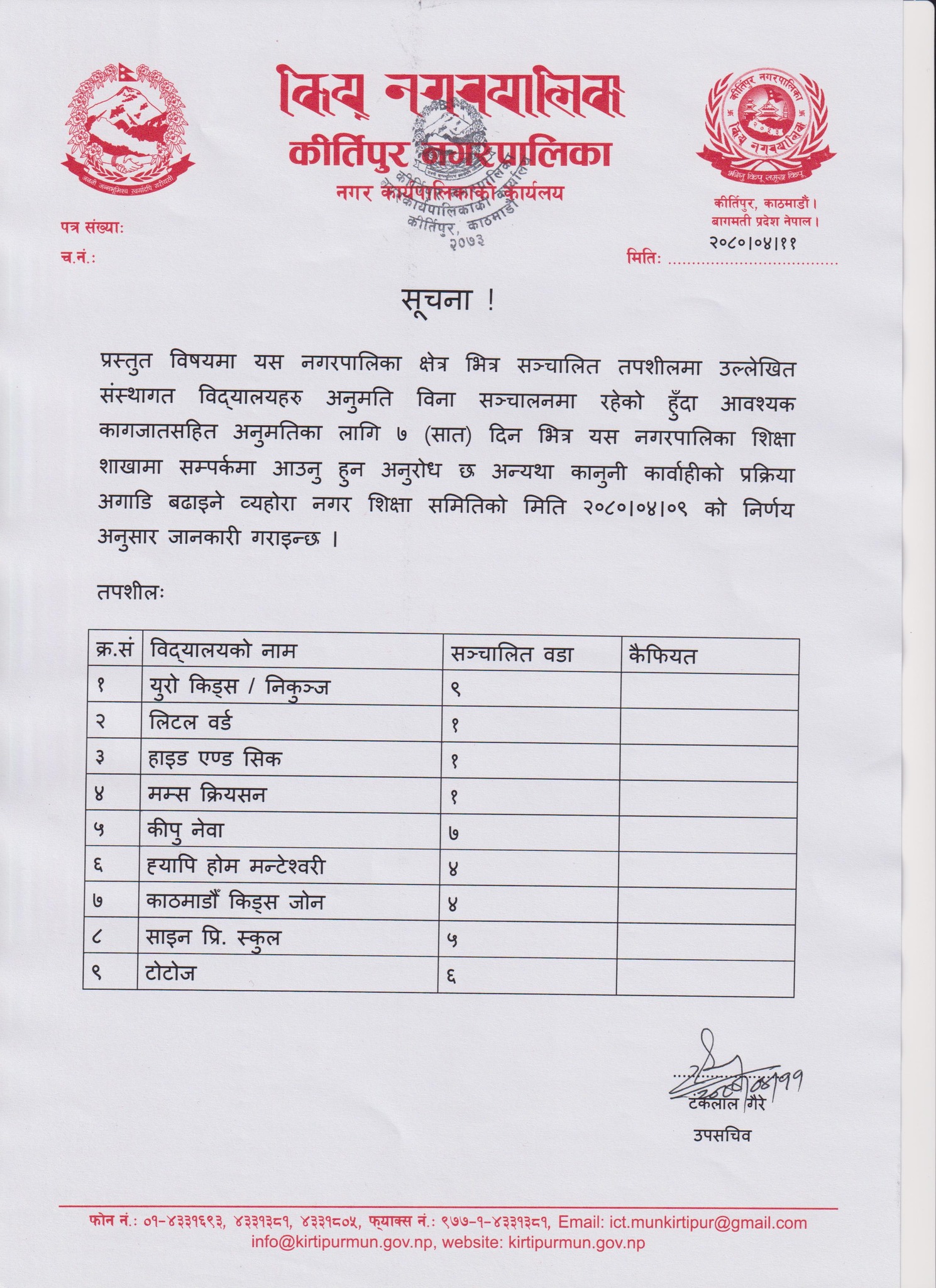 युरो किड्स, निकुञ्ज, लिटल वर्ड, हाइड एण्ड सिक, मम्स क्रियसन, कीपु नेवा, ह्यापि होम मन्टेश्वरी, काठमाडाैं किड्स जोन, साइन प्रि. स्कुल र टोटोज स्कुल कीर्तिपुर नगरपालिकाको अनुमति बिना सञ्चालनमा रहेको उपसचिव टंकलाल गैरेले जानकारी दिनुभयो ।