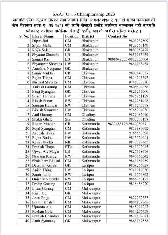 यू-१६ का लागि बागमतीबाट ४८ खेलाडी छनौट, चन्द्रागिरिबाट को को परे सूचीमा ? (नामावलीसहित)