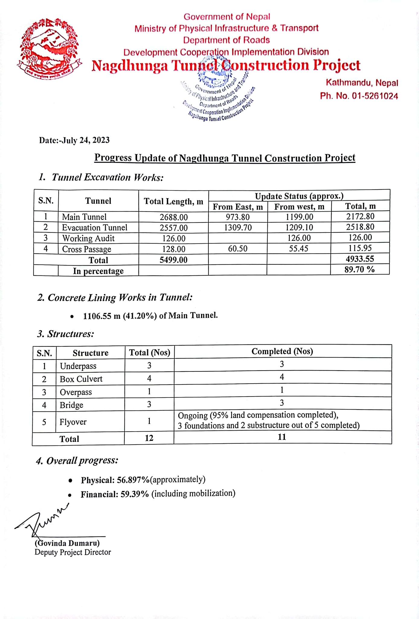 यस्तै बक्स कलभर्ट ४ मध्ये ४ वटै निर्माण सम्पन्न भएको छ । एउटा ओभर पास, ३ वटा पुलसमेत निर्माण सम्पन्न भएको नागढुंगा सुरूङ मार्ग आयोजनाले जनाएको छ।