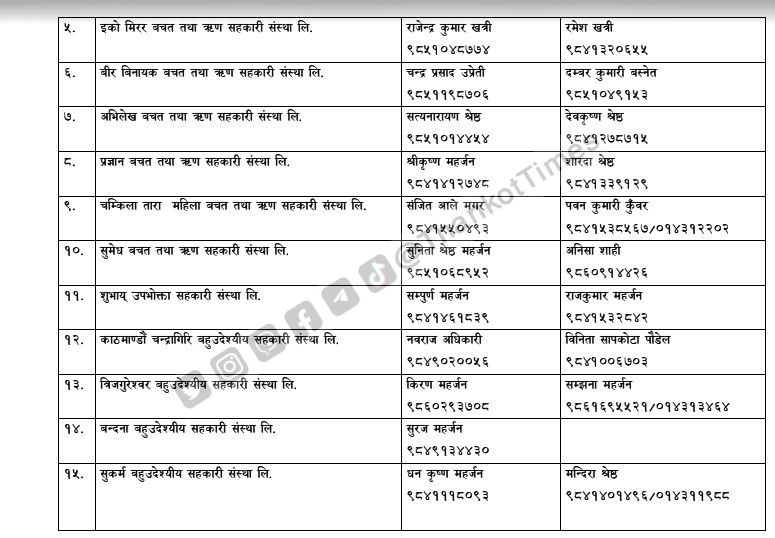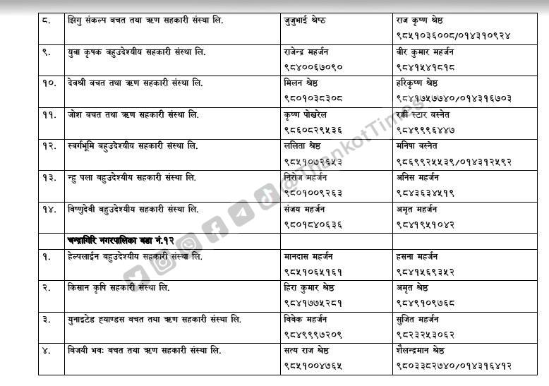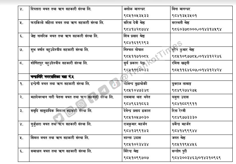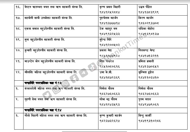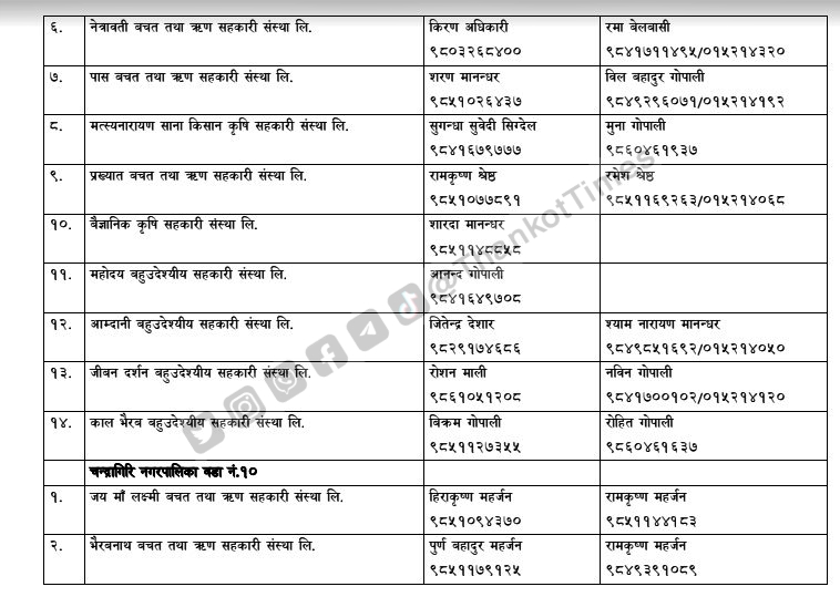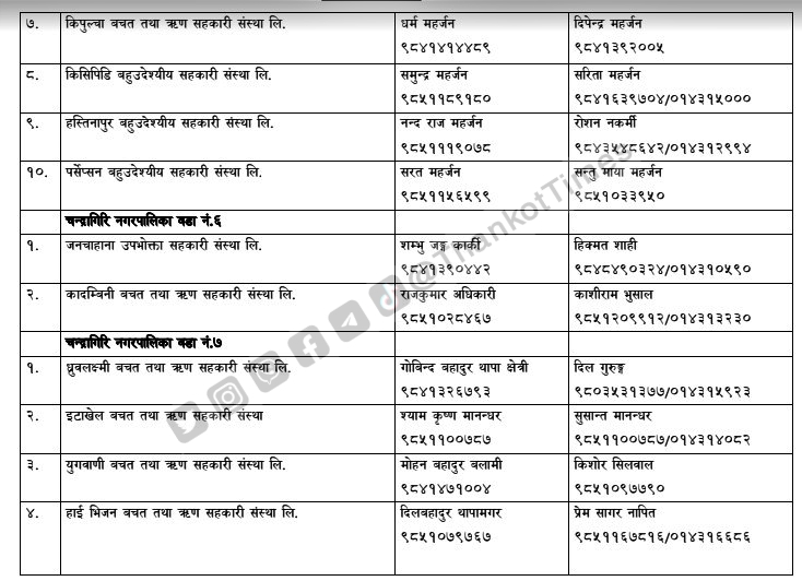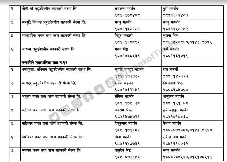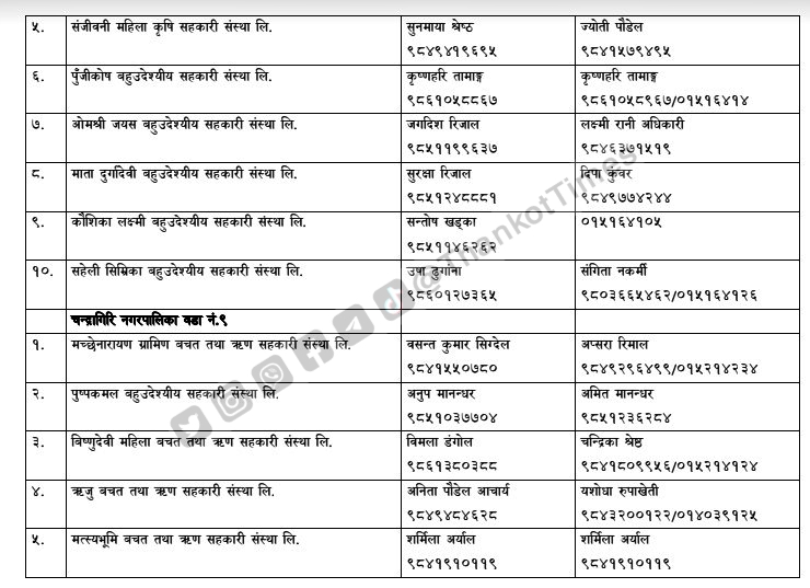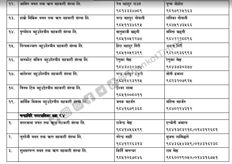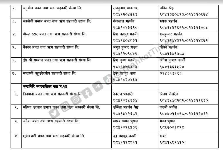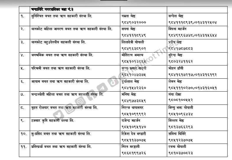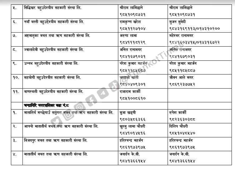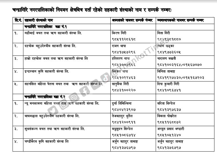 चन्द्रागिरि नगरपालिकाले नगरको नियमन क्षेत्रभित्र पर्ने सहकारी संस्थाहरूको सूची सार्वजनिक गरेको छ ।