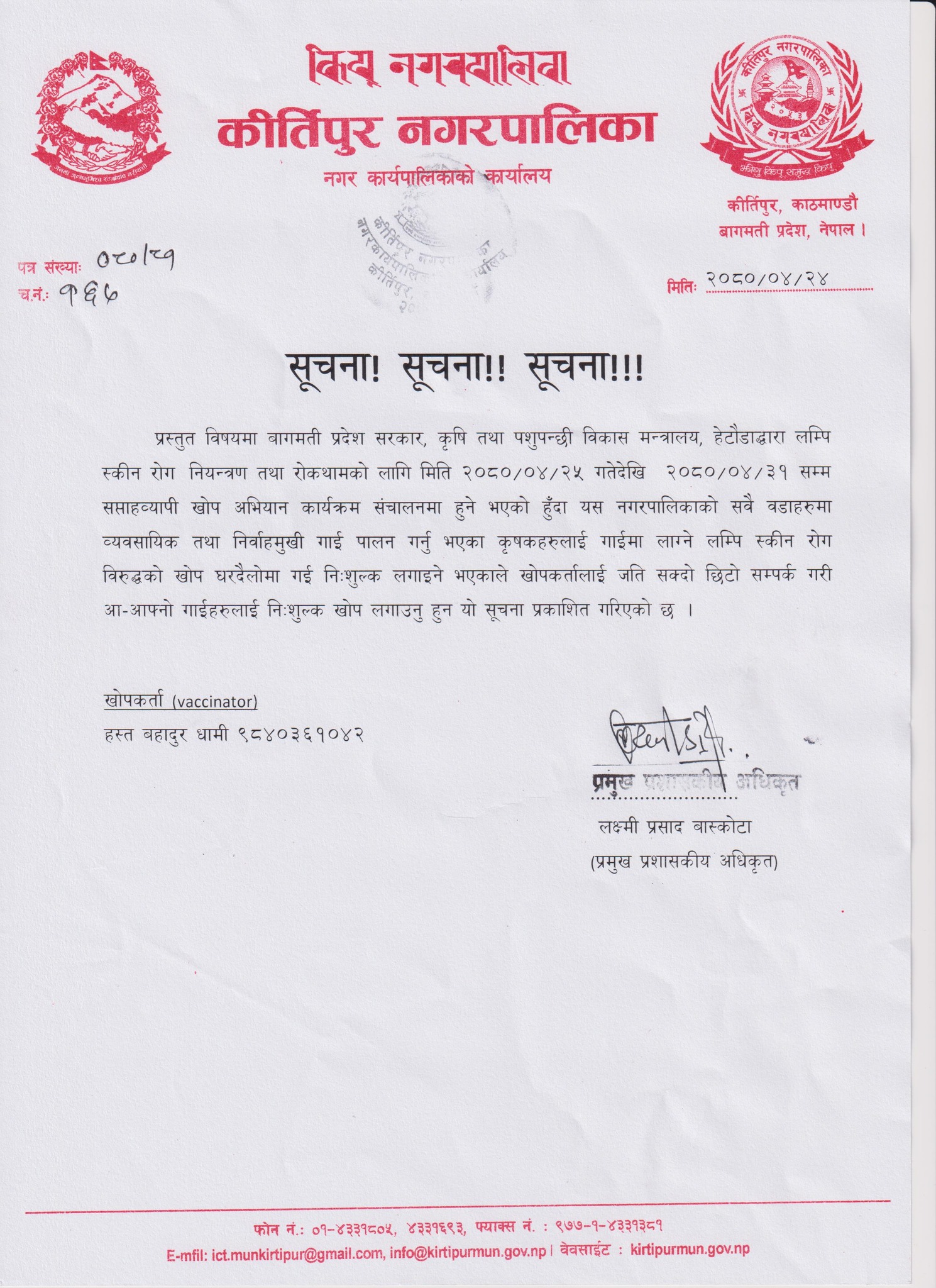 यसैबीच कीर्तिपुर नगरपालिकाले नगरका सबै वडाहरूमा व्यवसायिक तथा निर्वाहमुखी गाईपालन गरिरहेका कृषकहरूलाई लम्पी स्किनविरूद्ध घरदैलोमा पुगी खोप लगाउने भएको छ ।