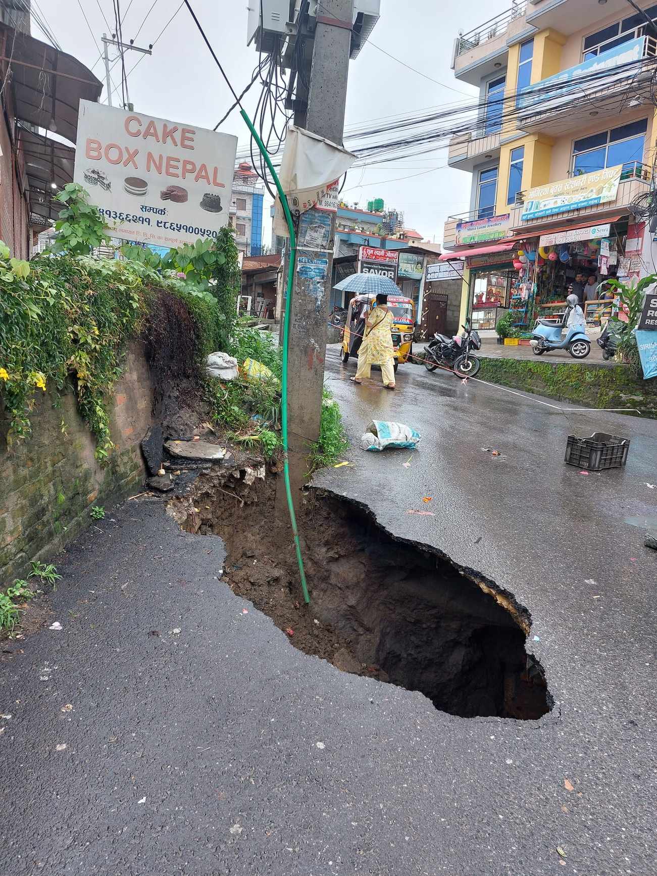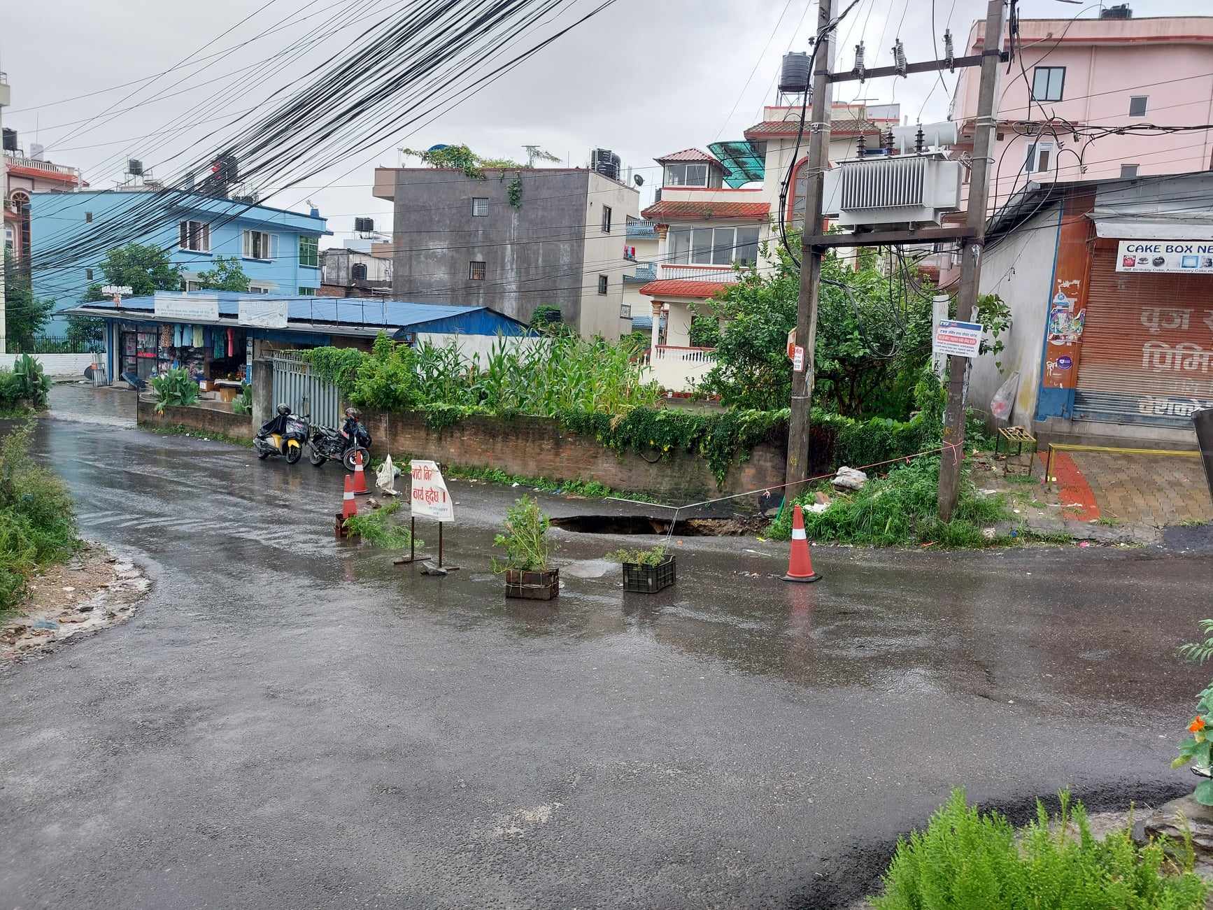 चन्द्रागिरि नगरपालिका १४ नयाँ नैकापका वडाध्यक्ष राजभाइ महर्जनका अनुसार न्यू डायमण्ड स्कुल अगाडि मुख्य सडक भासिएको हो । ढलमा पानीको बहाव बढ्दा मंगाल भासिएपछि पक्की सडकमा ठूलो खाडल परेको छ ।