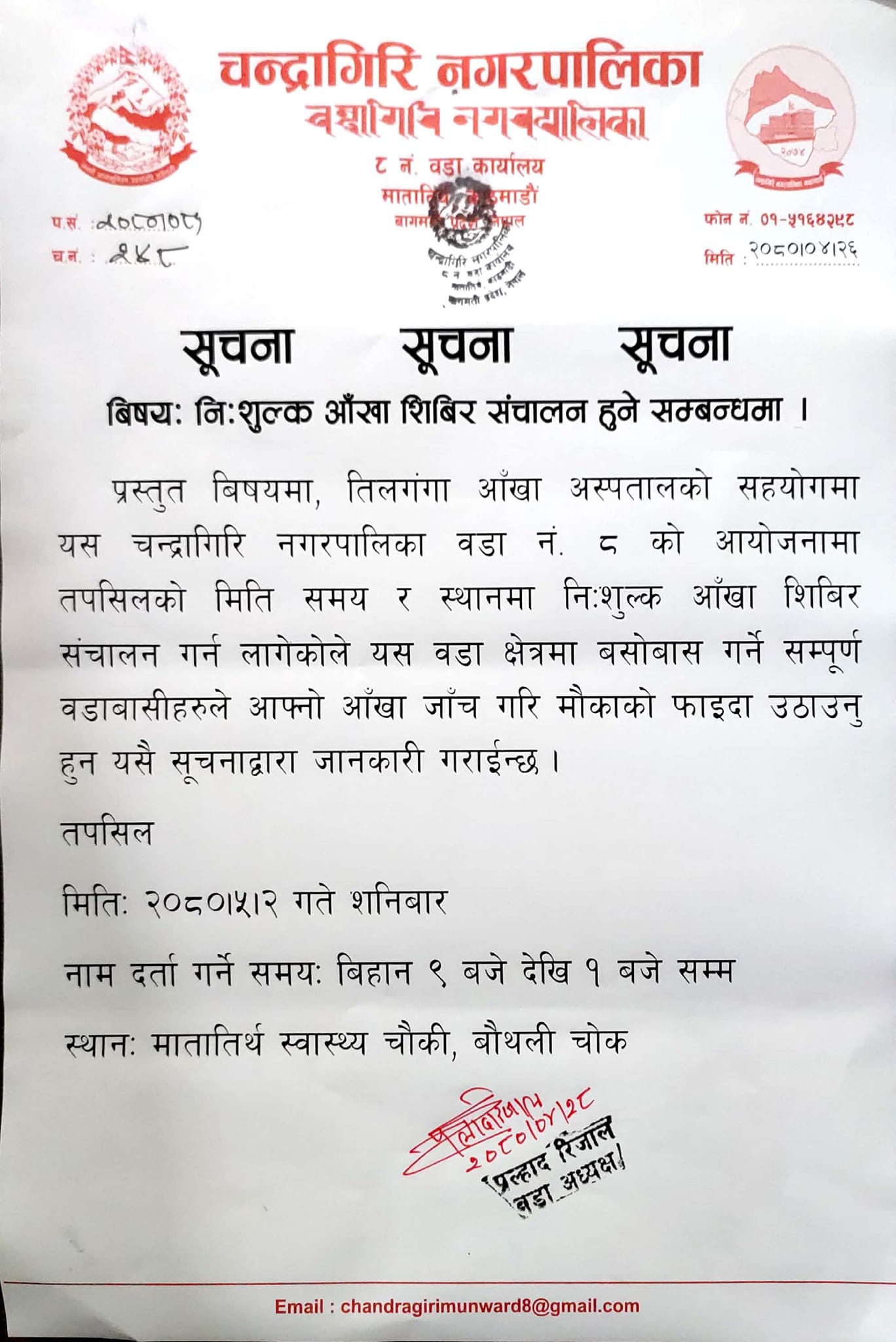 चन्द्रागिरि नगरपालिका ०८ मातातीर्थस्थित मातातीर्थ स्वास्थ्य चाैकीमा निःशुल्क आँखा शिविर सञ्चालन हुने भएको छ ।