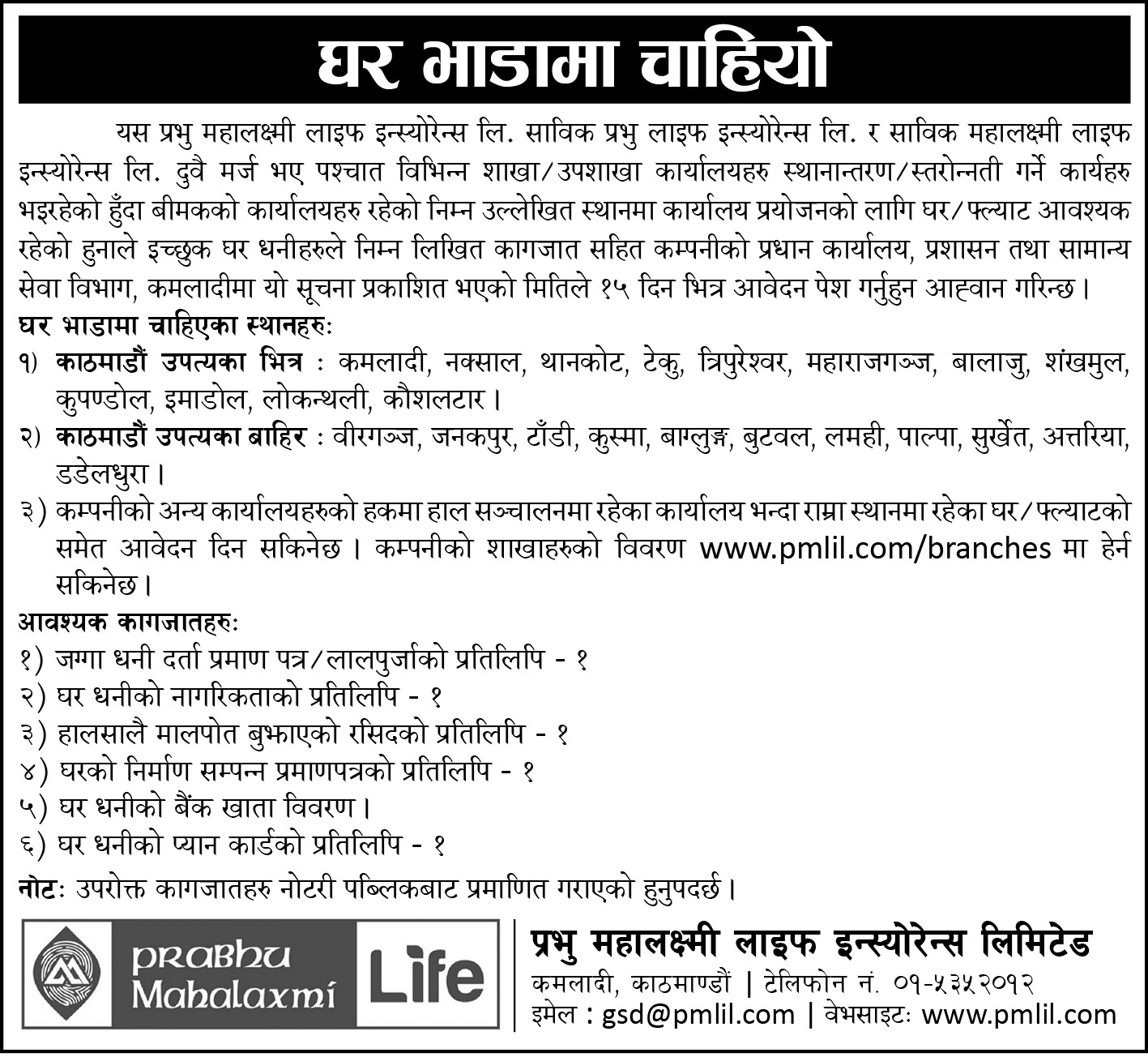 कम्पनीले विभिन्न स्थानमा रहेका कार्यालय प्रयोजनका लागि घर फ्ल्याट आवश्यक रहेको हुनाले ईच्छुक घरधनीले लिखित कागजात सहित प्रधान कर्यालय, प्रशासन तथा सामान्य सेवा विभाग कमलादीमा सूचना प्रकाशित भएको मितिले १५ दिनभित्र आवेदन पेश गर्न आव्हान गरेको छ ।