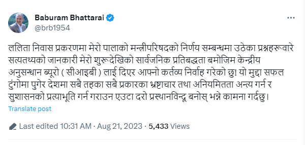 ‘ललिता निवास प्रकरणमा मेरो पालाको मन्त्रिपरिषदको निर्णय सम्बन्धमा उठेका प्रश्नहरूबारे सत्यतथ्यको जानकारी मेरो शुरू देखिको सार्वजनिक प्रतिबद्धता बमोजिम केन्द्रीय अनुसन्धान ब्यूरो (सीआइबी) लाई दिएर आफ्नो कर्तव्य निर्वाह गरेको छु’, भट्टराईले ट्वीटरमा लेखेका छन् ।