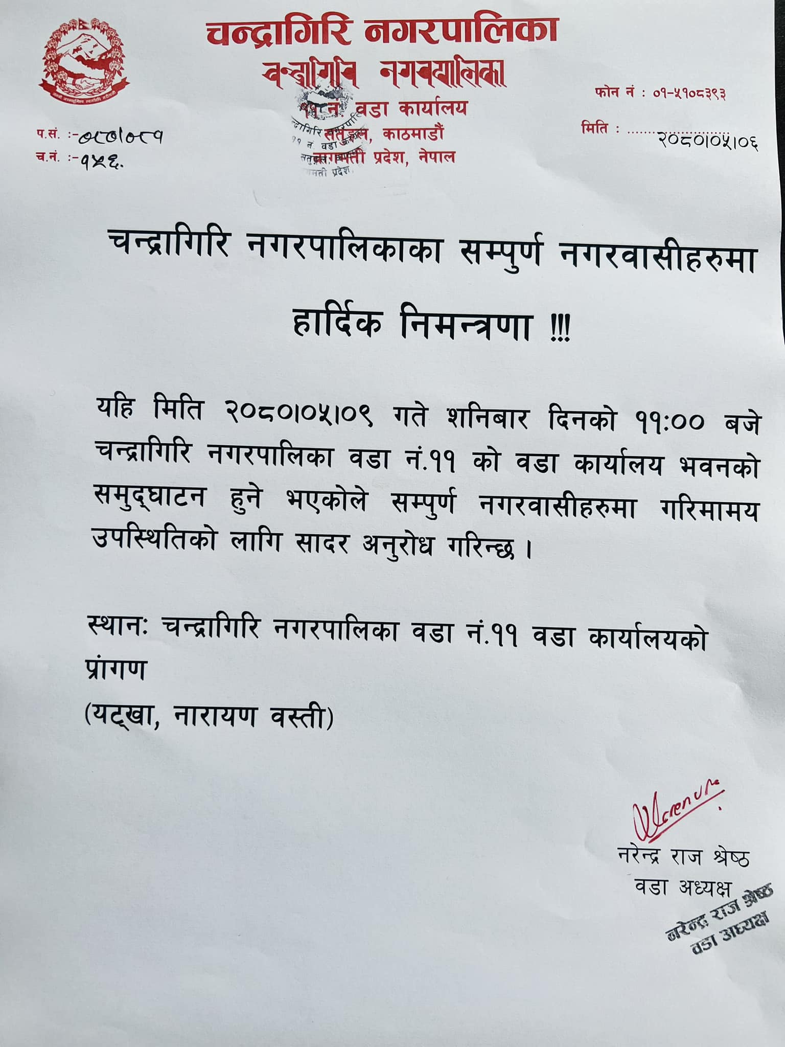 बुधबार एक सूचना जारी गर्दै वडा कार्यालयले भदाै ९ गते हुने भवनको उद्घाटनका लागि सबै नगरबासीहरूमा उपस्थितिका अनुरोध गरेको छ ।