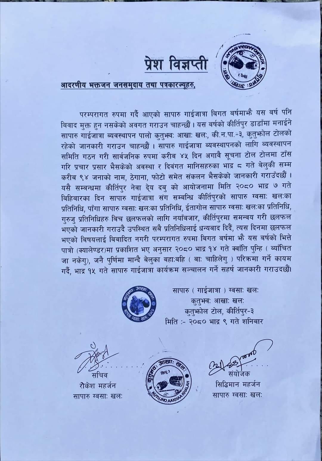 विज्ञप्तीमा परम्परागत रूपमा गर्दै आएको सापारू गाइजात्रा विगत वर्षमा झैं यस वर्षपनि विवादमुक्त हुन नसकेको बताइएको छ । साथै यसपटक कीर्तिपुर डाँडामा मनाइने सापारू व्यवस्थापन गर्ने पालो कीर्तिपुर नगरपालिका ३ को कुतुझ्वः आखाः खलः को रहेको बताइएको छ ।