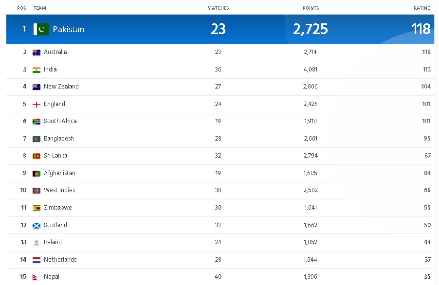 समान ११८रेटिङ अंक भएपनि अष्ट्रलियालाई दोश्रो स्थानमा छोड्दै दक्षिण एशियाली मुलुक पाकिस्तानले विश्व वरियताको पहिलो नम्बर आफुलाई उभ्याएको हो । नेपाल सो वरियताको १५औं स्थानमा छ ।