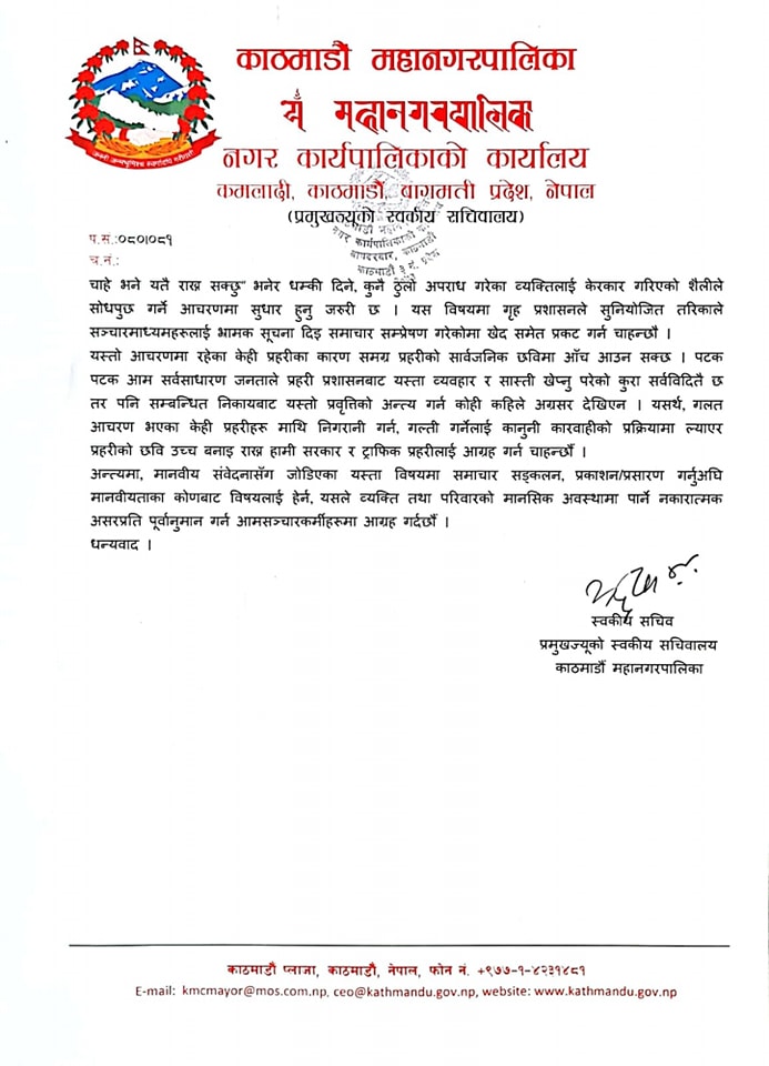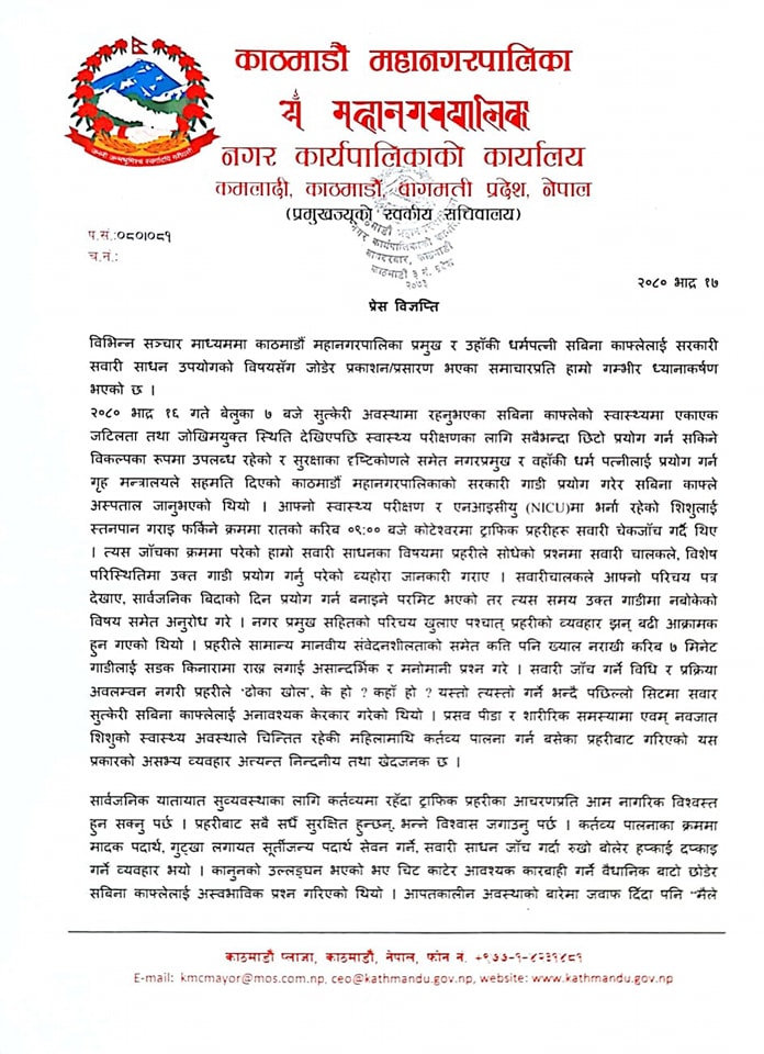 महानगरप्रमुखको सचिवालयबाट जारी सो विज्ञप्तिमा भनिएको छ, ‘‘सार्वजनिक यातायात सुव्यवस्थाका लागि कर्तव्यमा रहँदा ट्राफिक प्रहरीका आचरणप्रति आमनागरिक विश्वस्त हुन सक्नुपर्छ । प्रहरीबाट सबै सधैं सुरक्षित हुन्छन् भन्ने विश्वास जगाउनु पर्छ । कर्तव्य पालनाका क्रममा मादकपदार्थ, गुट्खालगायत सुर्तीजन्य पदार्थ सेवन गर्ने, सवारीसाधन जाँच गर्दा रुखो बोलेर हप्काई दप्काइ गर्ने व्यवहार भयो । कानूनको उल्लङ्घन भएको भए चिट काटेर आवश्यक कारबाही गर्ने वैधानिक बाटो छोडेर सविना काफ्लेलाई अस्वाभाविक प्रश्न गरिएको थियो । आपतकालीन अवस्थाको बारेमा जवाफ दिँदा पनि ‘मैले चाहें भने यतै राख्न सक्छु’ भनेर धम्की दिने, कुनै ठूलो अपराध गरेका व्यक्तिलाई केरकार गरिएको शैलीले सोधपुछ गर्ने आचरणमा सुधार हुनु जरुरी छ । यस विषयमा गृह प्रशासनले सुनियोजित तरिकाले सञ्चारमाध्यमहरूलाई भ्रामक सूचना दिइ समाचार सम्प्रेषण गरेकोमा खेद समेत प्रकट गर्न चाहन्छौं ।’