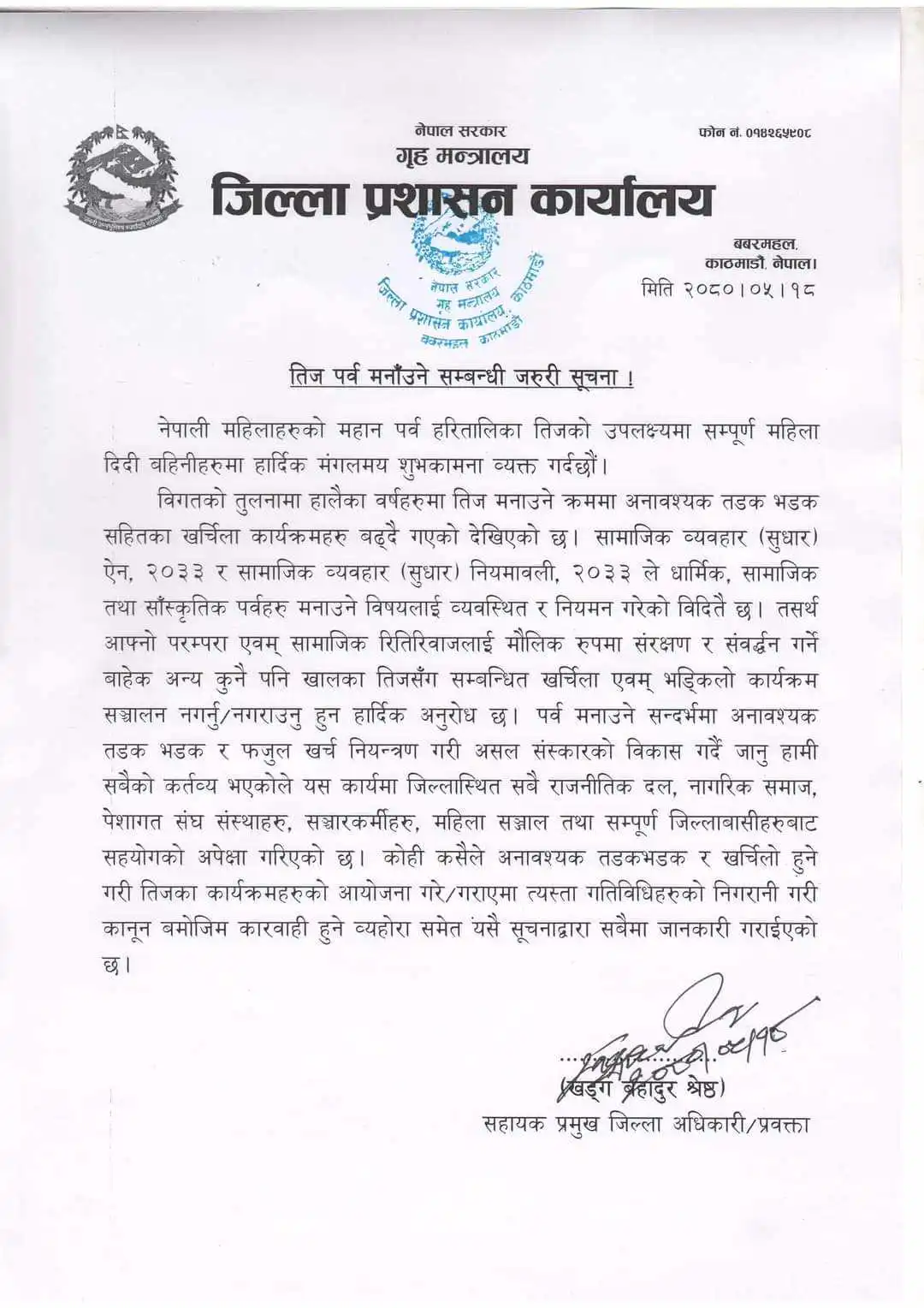 जिल्ला प्रशासन कार्यालय काठमाडौंले तिजलाई भड्किलो नबनाउन निर्देशन दिँदै मंगलबार विज्ञप्ति जारी गरेको छ ।