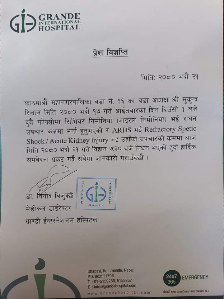 काठमाडौं महानगरका वडाध्यक्ष मुकुन्द रिजालको निधन