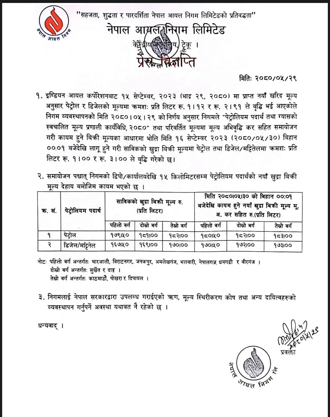 आज राति १२ बजेदेखि लागु हुनेगरी निगमले पेट्रोलमा प्रतिलिटर १ रुपैयाँ र डिजलमा ३ रुपैयाँ बढाएको हो ।