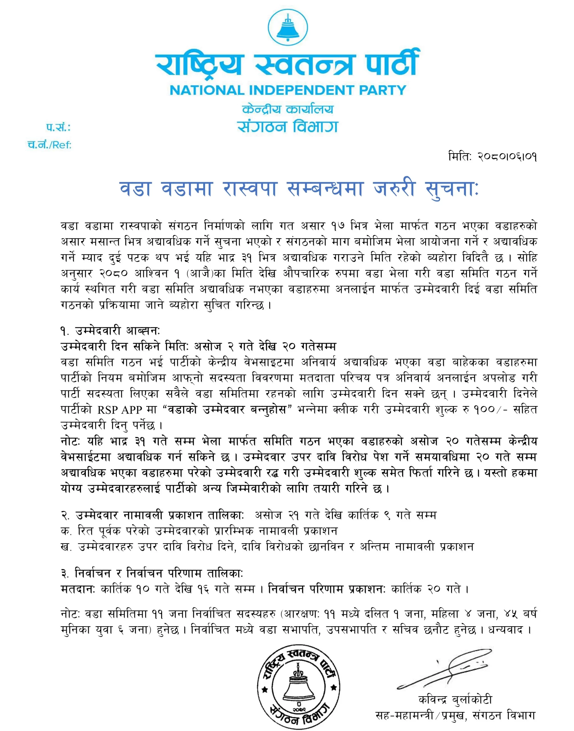 राष्ट्रिय स्वतन्त्र पार्टी (रास्वपा)ले  ६ हजार पाँच सय वडामा समिति गठनका लागि आज आह्वान गरेको छ । रास्वपाले असोज २ देखि २० सम्म उम्मेदवार दर्ताका लागि अनलाइन आह्वान गरेको रास्वपाका सहमहामन्त्री तथा सङ्गठन विभाग प्रमुख कवीन्द्र बुर्लाकोटीले बताए ।