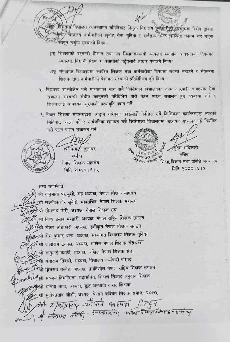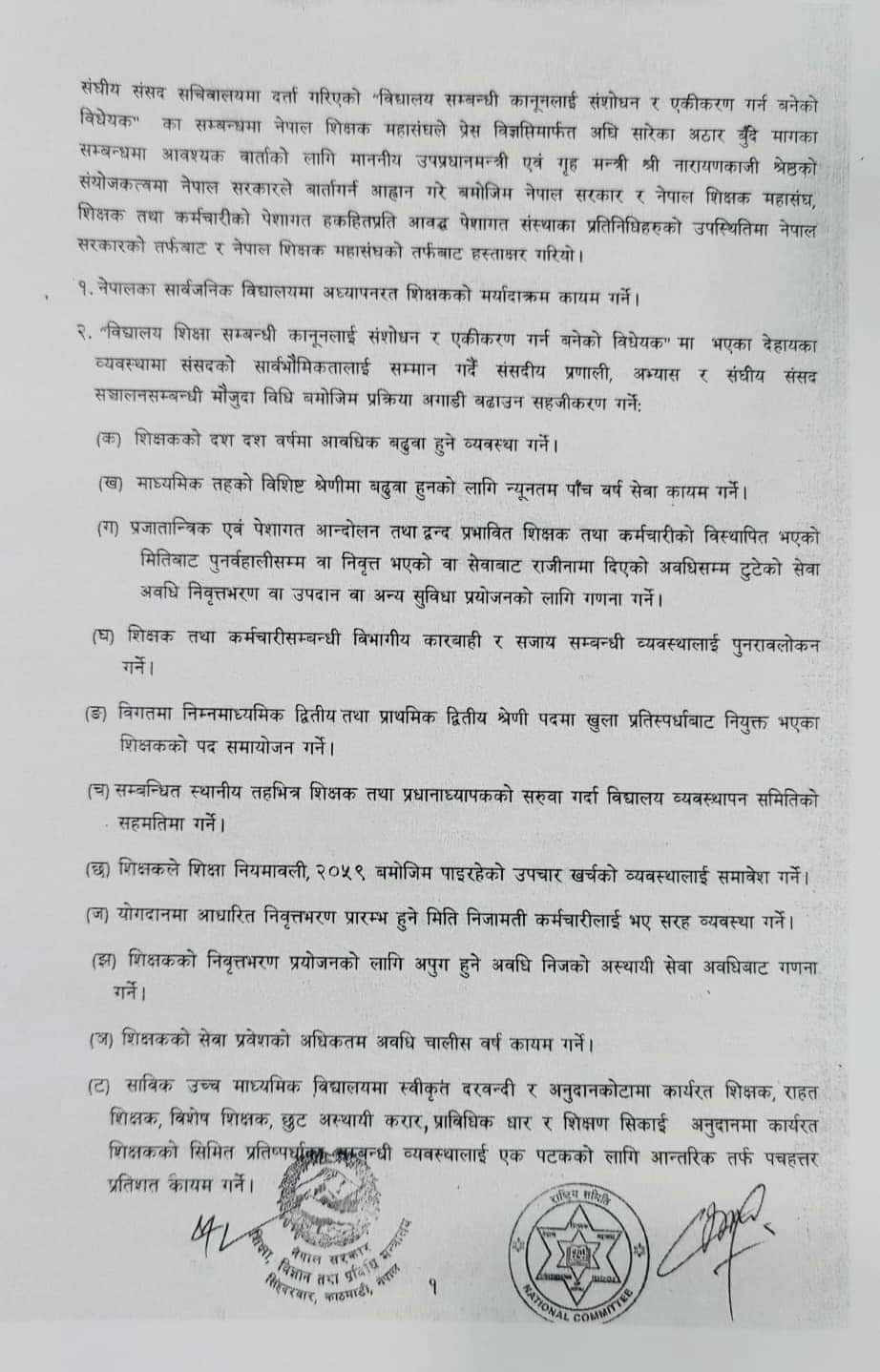 शिक्षकको समायोजन, तहगत प्रणाली र आवधिक बढुवाका विषयमा नेपाल शिक्षक महासंघ र विज्ञसमेतको प्रतिनिधित्व हुनेगरी अध्ययन समिति गठन गर्ने र समितिको प्रतिवेदनबमोजिम आवश्यक कानूनी प्रबन्ध गर्ने सहमति भएको छ।