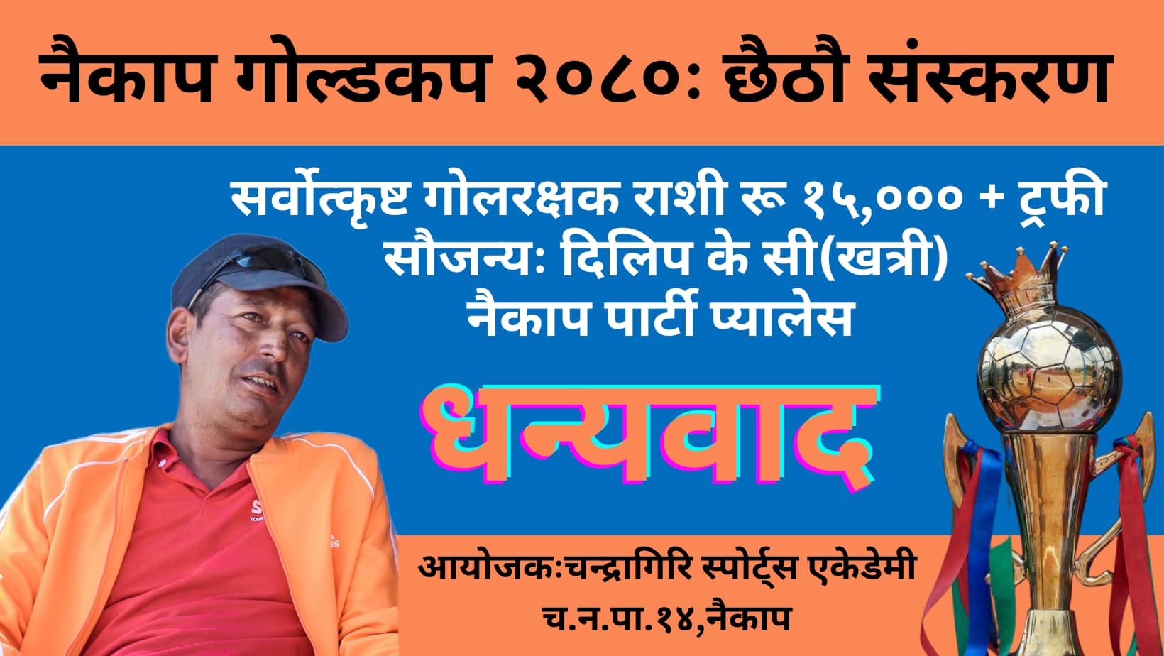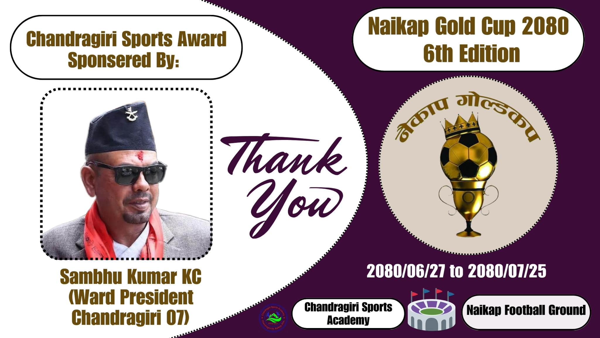 यही असोज २७ गतेबाट सुरू हुने चन्द्रागिरि नगरकै प्रमुख फुटबल उत्सव नैकाप गोल्डकपको छैठाैं संस्करणको समापनका क्रममा प्रदान गरिने सो सम्मानका लागि चन्द्रागिरि नगरपालिका ०७ महादेवस्थानका वडाध्यक्ष शम्भुकुमार केसीले प्रायोजन गर्ने भएका छन् । गत संस्करणमा भलिबल स्टार प्रतिभा मालीले यो सम्मान प्राप्त गरेकी थिइन् ।