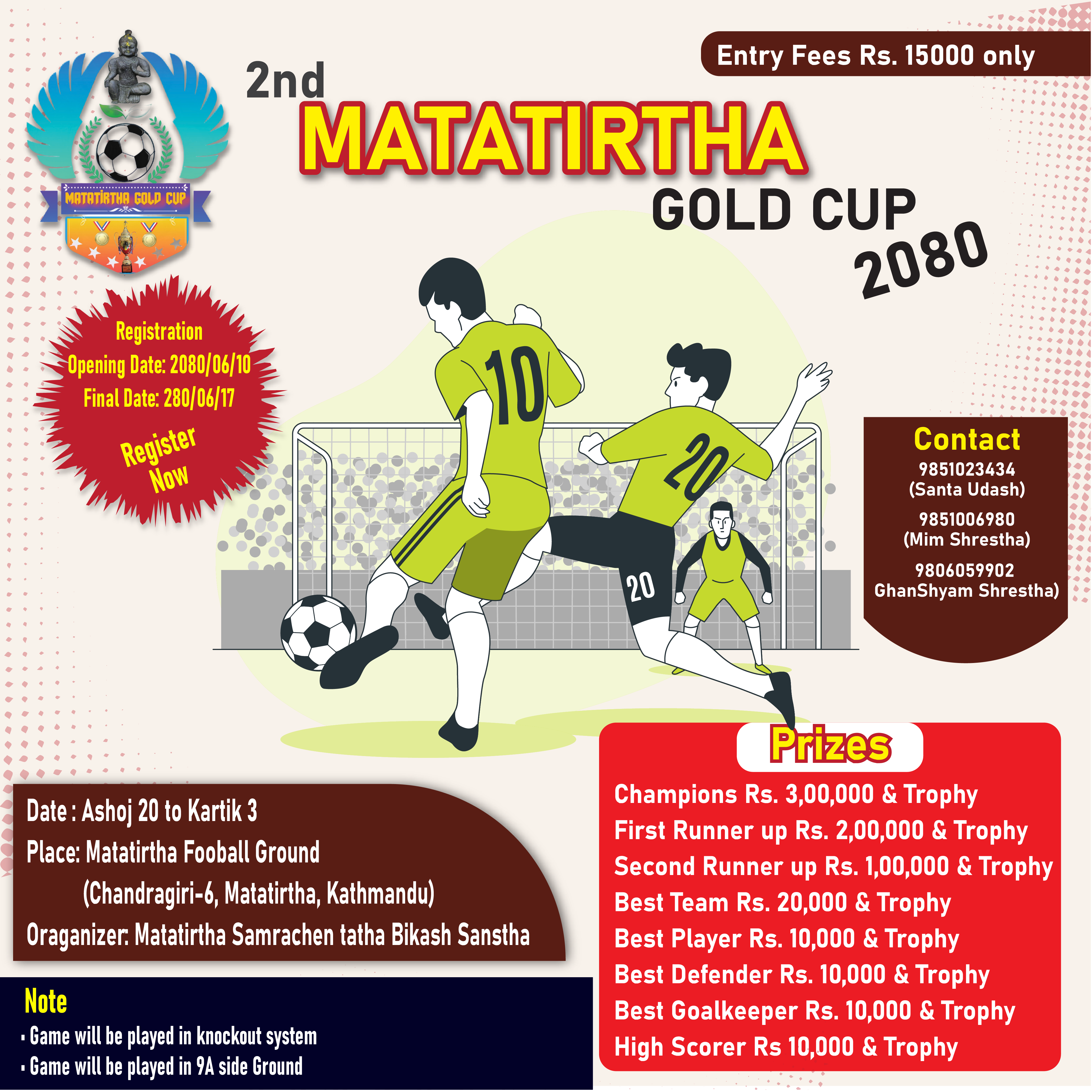 फाइनल खेल कार्तिक ३ गते खेलाइने सो प्रतियोगितामा सहभागिताका लागि १५ हजार रूपैयाँ दर्ता शुल्क लाग्ने बताइएको छ ।