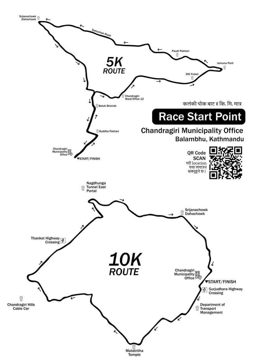 यसैगरी, ५ किलोमिटर दाैड चन्द्रागिरि नगरपालिकाकाे कार्यालयबाट सरु भई बलम्बु बुद्ध पाेखरी – वडा नं.१२ काे कार्यालय – डिआईजी फुटसल – जमुनापाटी – पाैडी पाेखरी – दहचाेक – सृजना चाेकहुँदै चन्द्रागिरि नगरपालिकाकाे कार्यालयमा पुगेर सकिनेछ ।
