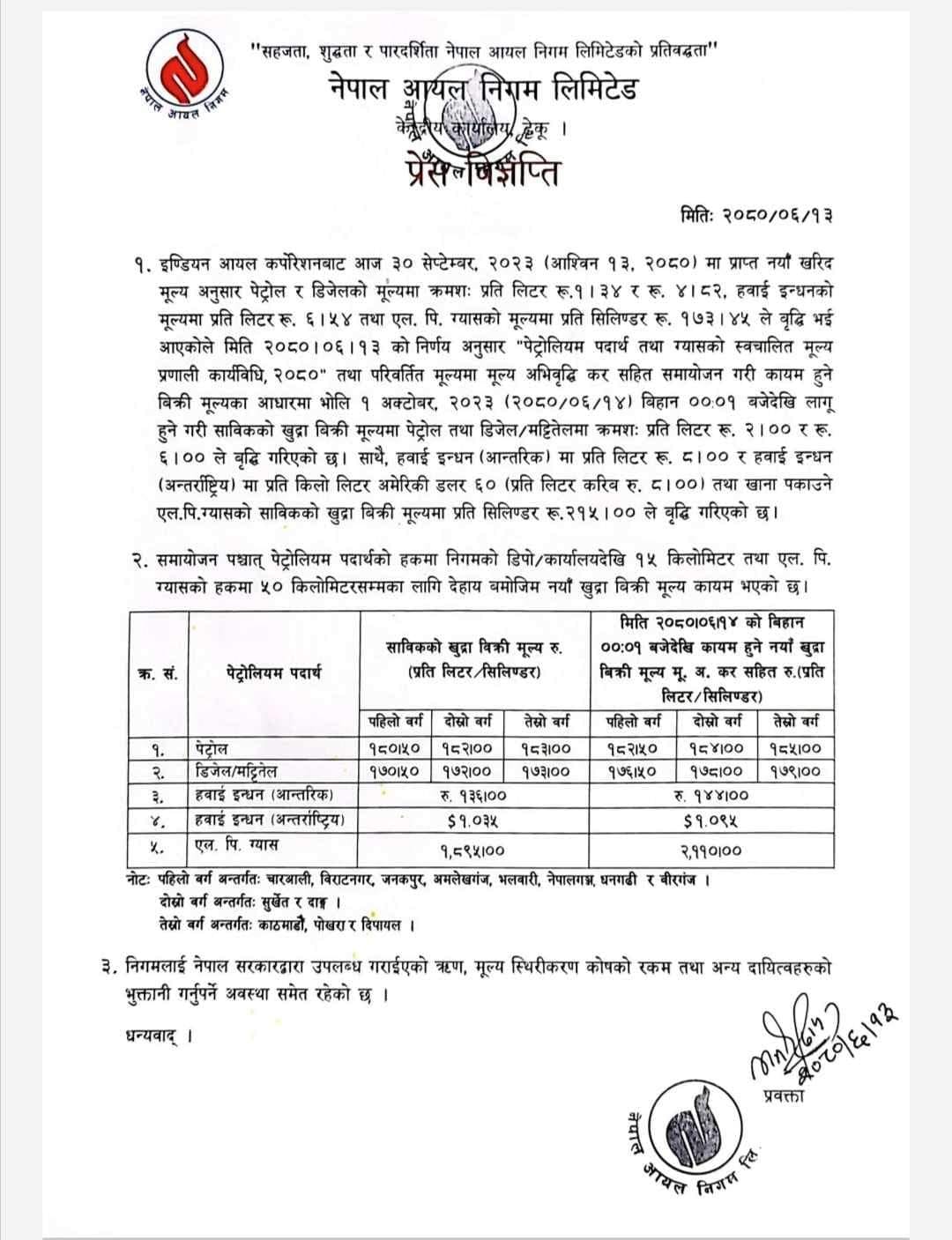 नेपाल आयल निगमले पेट्रोलियम पदार्थको मूल्य वृद्धि गरेको छ ।