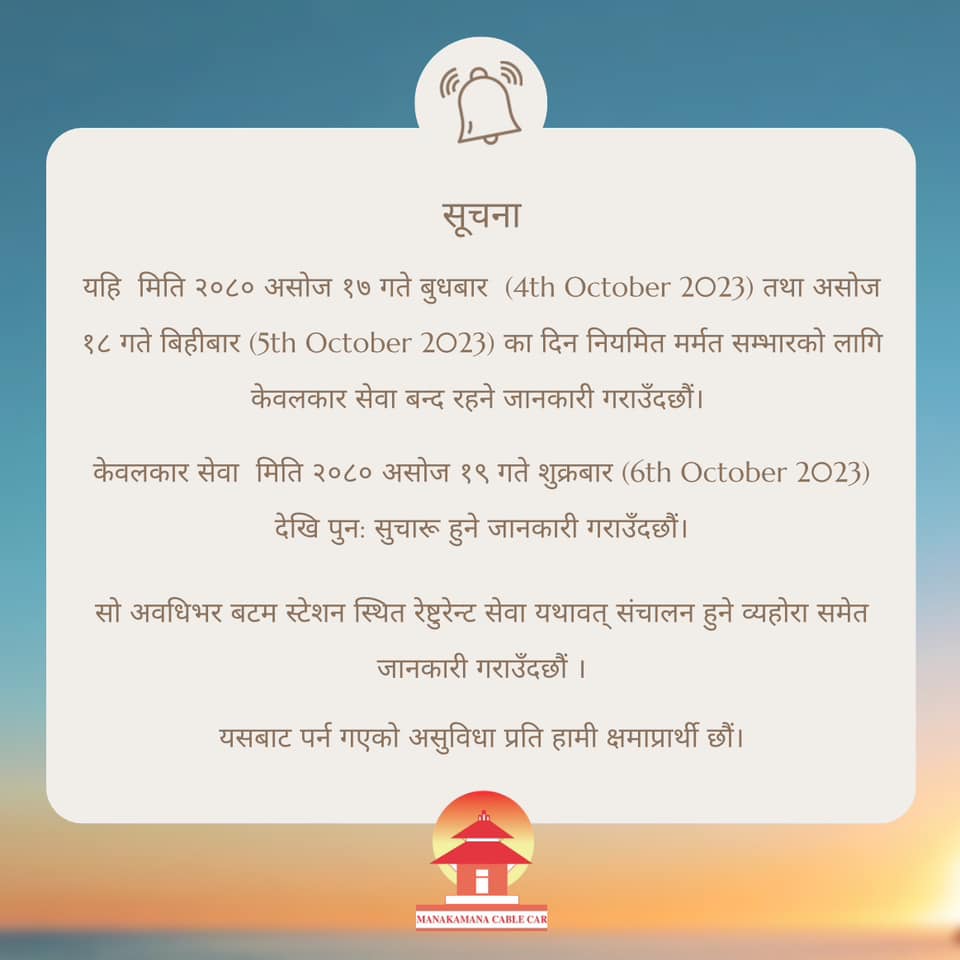 नियमित मर्मत कार्यका लागि ती दिन केबलकार सेवा बन्द हुन लागेको मनकामना केबलकार प्रा.लि.ले जनाएको छ।