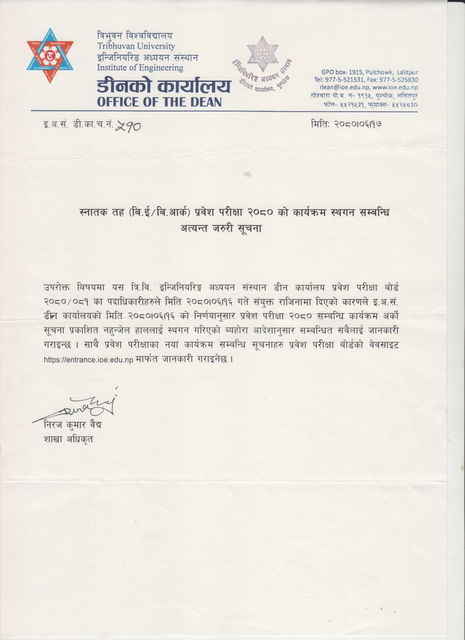 त्रिवि डीनको कार्यालयले बुधवार एक सूचना जारी गर्दै स्नातक तह (बी.ई./बी.आर्क) को प्रवेश परीक्षा स्थगित गरेको हो ।