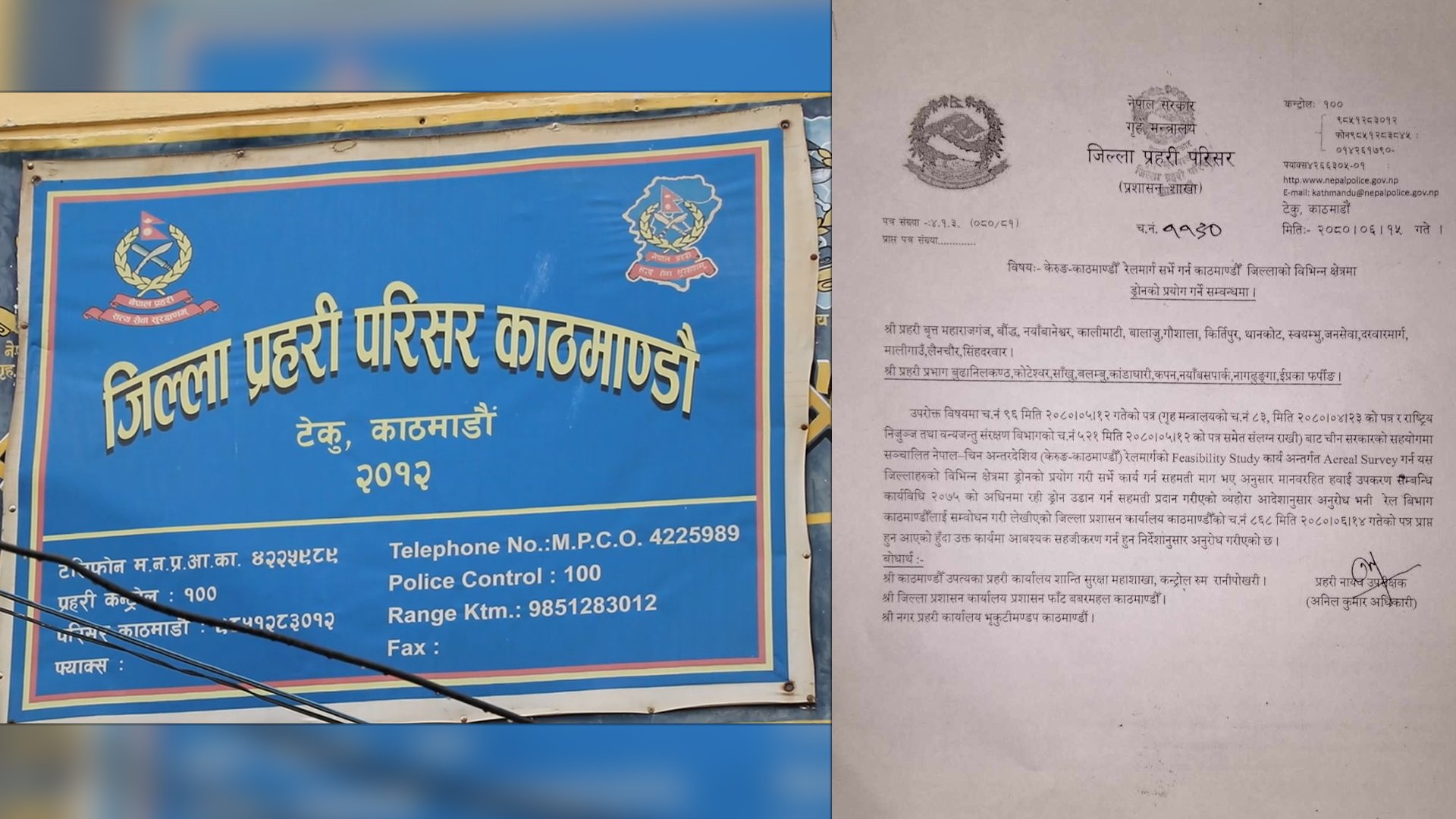 जिल्ला प्रहरी परिसर,काठमाडौंले केरुङ-काठमाडौं रेलमार्ग सर्भेका लागि ड्रोन प्रयोगमा सहजीकरण गरिदिन आफू मातहतका प्रहरी कार्यालयलाई निर्देशन दिएको छ।