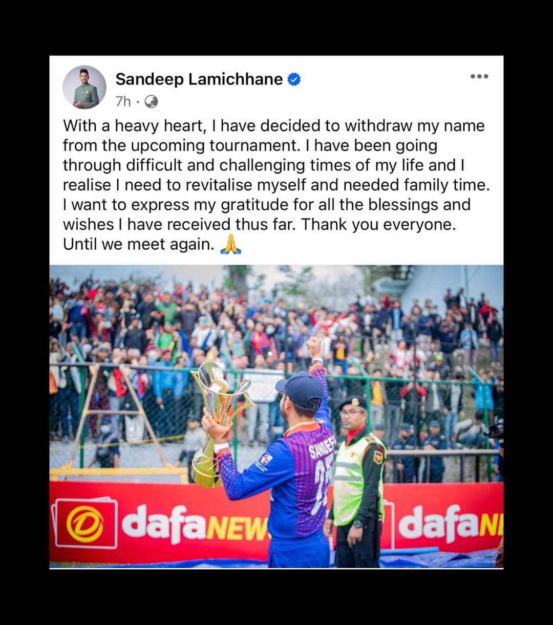 क्रिकेटर सन्दीप लामिछानेले नेपाली राष्ट्रिय टिमबाट आगामी दिनका प्रतियोगिता नखेल्ने घोषणा गरेका छन् । गए राति सामाजिक सञ्जालमार्फत उनले यस्तो घोषणा गरेका हुन् । उनले आफू कठिन परिस्थितिबाट गुज्रिरहेको उल्लेख गर्दै आफूलाई पुनर्जागृत गर्न आवश्यक रहेकाे र त्यसका लागि केही समय परिवारसँगै बस्न चाहेको उल्लेख गरेका छन् ।