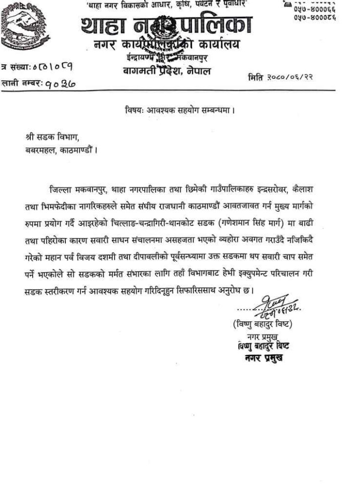 चन्द्रागिरि नगरपालिका तथा मकवानपुरको थाहा नगरको पहलमा सो सडक मर्मत सुरु भएको बताइएको छ। सडकका लागि सडक विभागले समेत सहजीकरण गरेको बताइएको छ ।
