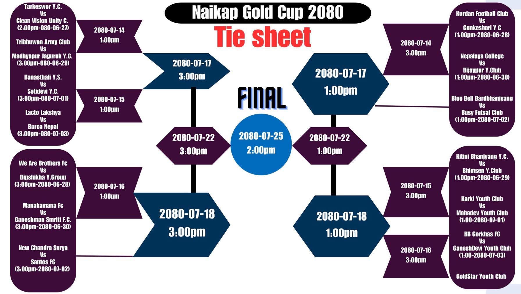 चन्द्रागिरि स्पोर्ट्स एकेडेमीको आयोजनामा चन्द्रागिरि नगरपालिका-१४ स्थित नैकाप फुटबल मैदानमा सञ्चालन हुने छैटाैं संस्करणको नैकाप गोल्डकप प्रतियोगिताको उद्घाटन खेलमा साबिक विजेता नागार्जुन नगरपालिकाको तारकेश्वर युथ क्लब र चन्द्रागिरि नगरपालिका ०५ महादेवस्थानको क्लीन भीजन यूनिटिबीच खेल हुनेछ । खेल दिउँसो २ बजे सुरु हुनेछ सो अघि बिहान ११ बजेबाट प्रतियोगिताको उद्घाटन समारोह प्रारम्भ हुनेछ । सो क्रममा चन्द्रागिरि नगरका मेयर, चन्द्रागिरि नगरका उपमेयर, नागार्जुन नगरका मेयर, अखिल नेपाल फुटबल संघका केन्द्रीय अध्यक्ष लगायतको उपस्थिति रहने बताइएको छ ।