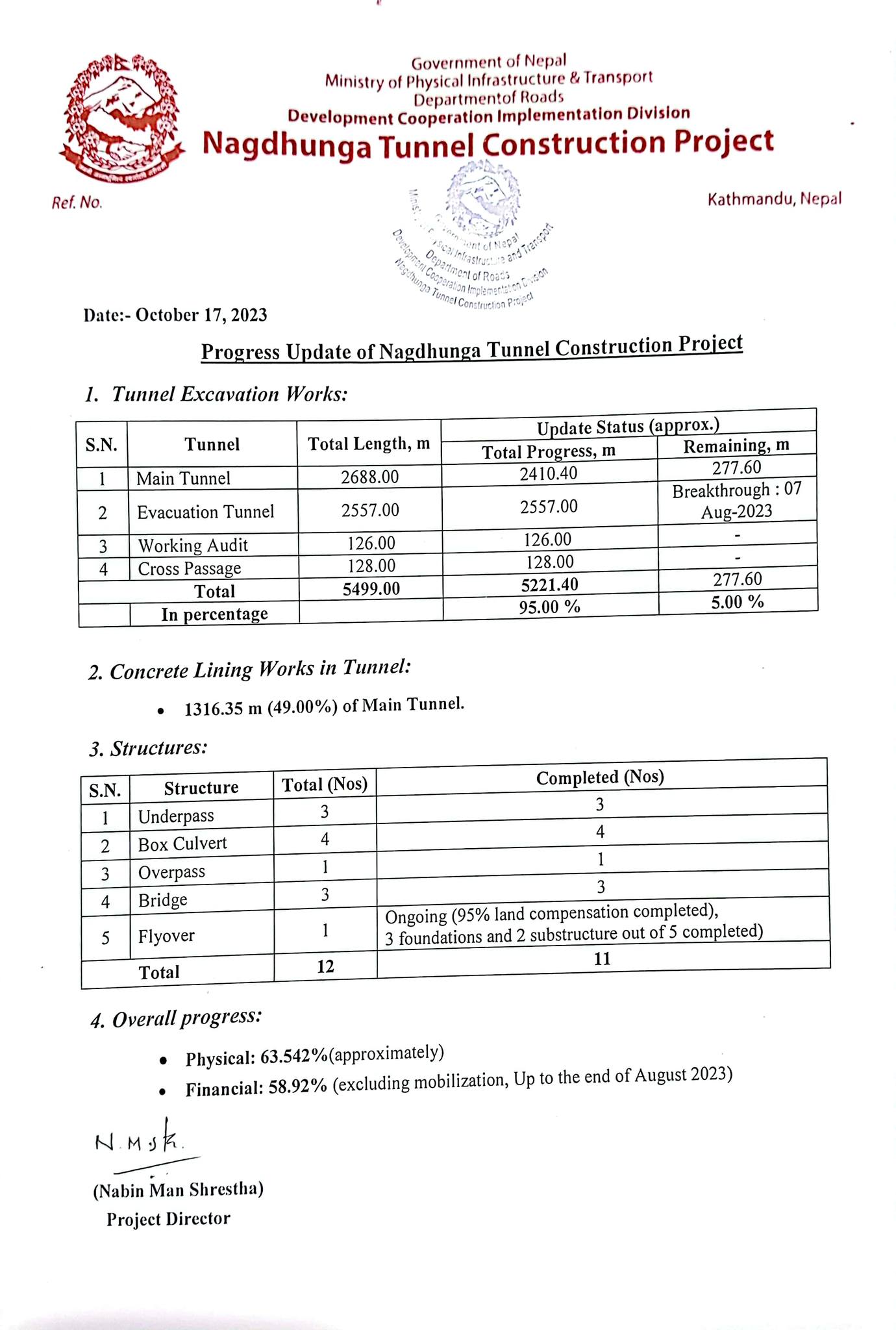 चन्द्रागिरि नगरमा निर्माण भइरहेको राष्ट्रिय गाैरवको आयोजना नागढुंगा सुरुङ मार्गको मुल सुरङ खन्न अब २ सय ७७ मिटर अर्थात् ५ प्रतिशत काम बाँकी छ।