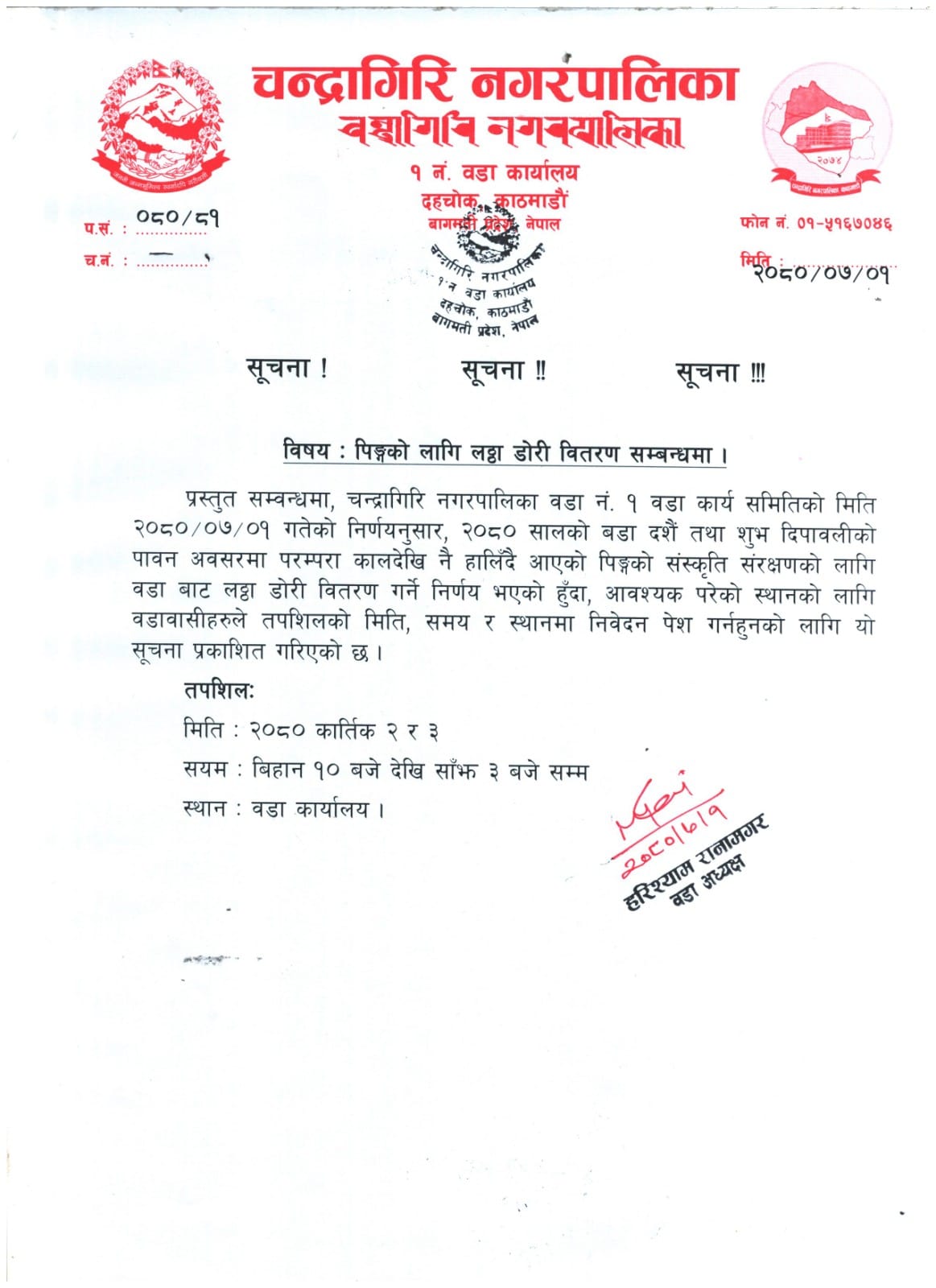 बुधबार एक सूचना जारी गर्दै वडा कार्यालयले परम्परागत उत्सव महत्वपूर्ण पक्षको जगेर्नाका लागि लठ्ठा वितरण गर्न लागेको जनाएको छ ।