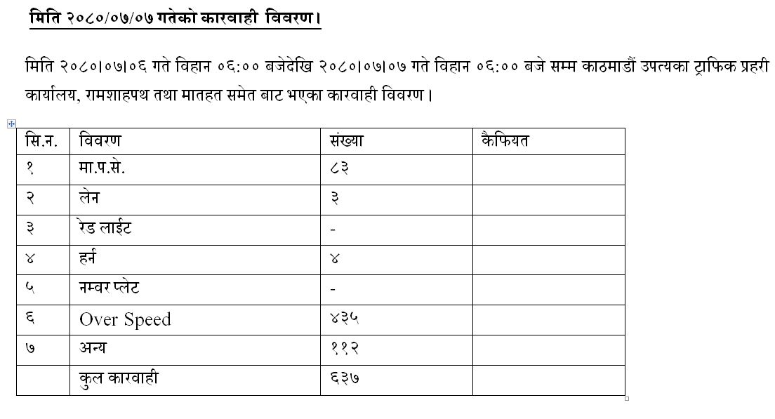 काठमाडाैं उपत्यका ट्राफिक प्रहरी कार्यालय, रामशाहपथ तथा मातहत समेतबाट भएका कारबाहीको विवरण ट्राफिक प्रहरीले सार्वजनिक गरेको छ ।