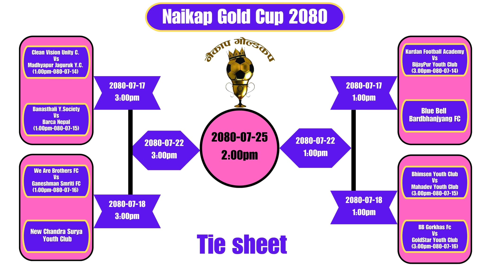 कार्तिक १७ गते र १८ गते अन्तिम ८ का खेल सञ्चालन हुँदा कार्तिक २२ गते सेमीफाइनलका दुवै खेल हुनेछन् भने कार्तिक २५ गते यमपञ्चकको दोश्रो दिन उपाधि छिनोफानो हुनेछ ।