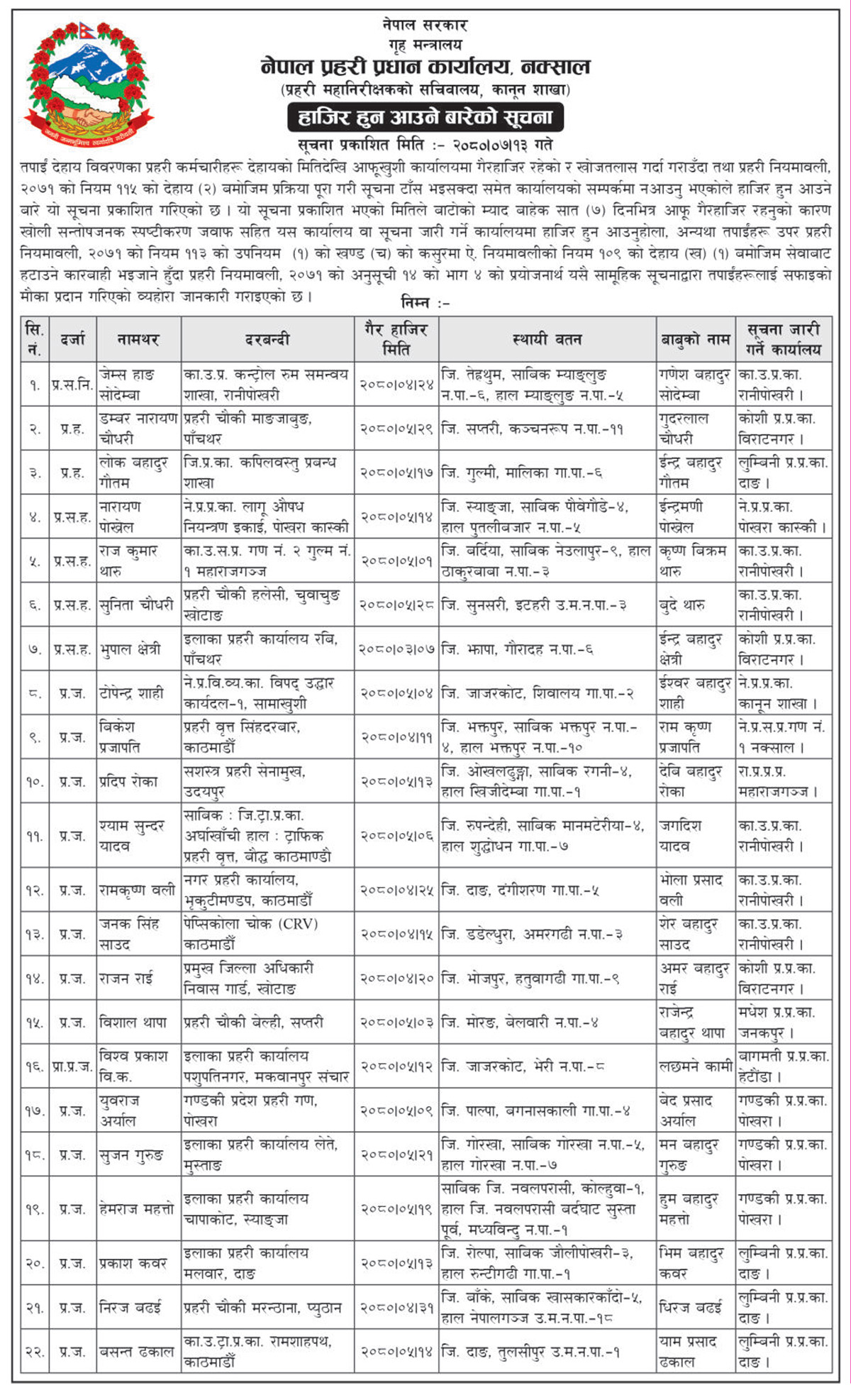 “गैरहाजिर रहनुको कारणसहित सन्तोषजनक स्पष्टीकरण जवाफसहित यस कार्यालय वा सूचना जारी गर्ने कार्यालयमा हाजिर हुन आउनुहोला,” सूचनामा उल्लेख छ, “अन्यथा तपाईंहरू उपर प्रहरी नियमावली, २०७१ को नियम ११३ को उपनियम (१) को खण्ड (च) को कसुरमा ऐ. नियमावलीको नियम १०९ को देहाय (ख) (१) बमोजिम सेवाबाट हटाउने कारबाही हुनेछ ।”
