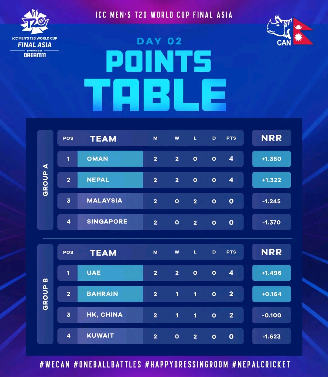 जितसँगै दुई खेलबाट चार अंक जोडेको नेपाल समूहको शीर्ष स्थानमा छ । यसअघि, नेपालले प्रतियोगिताको पहिलो खेलमा सोमबार सिंगापुरविरुद्ध आठ विकेटको सहज जित निकालेको थियो । लगातार दोस्रो हार बेहोरेको मलेसिया भने प्रतियोगिताबाट बाहिरिने निश्चित बनेको छ ।