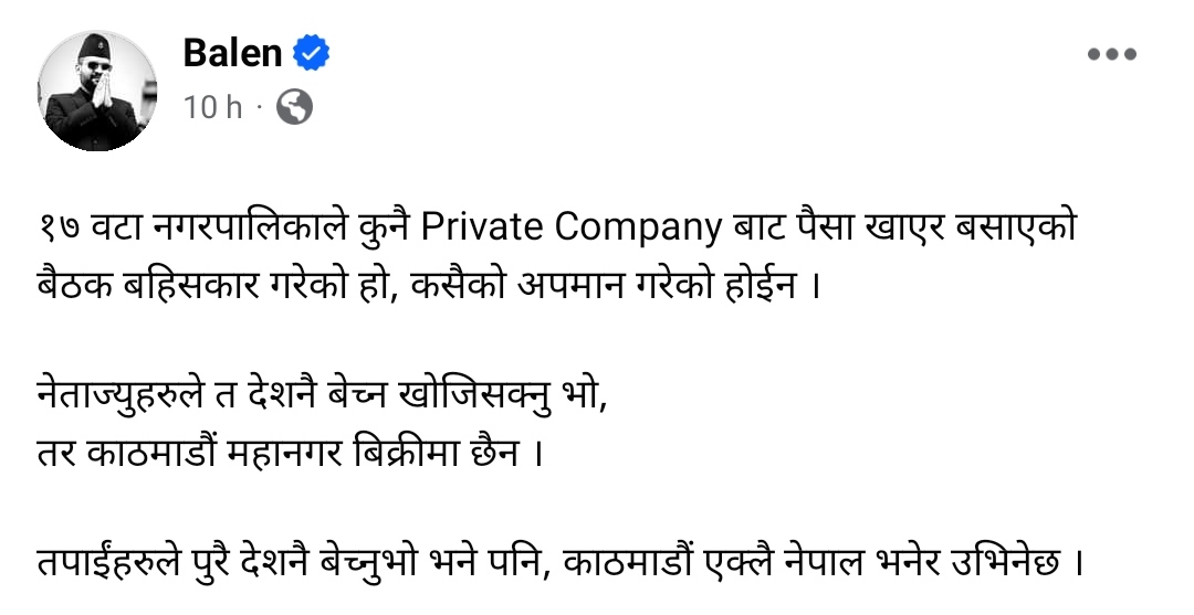 मेयर बालेनको आरोप, ‘काठमाडौंका १७ वटा नगरपालिकाले निजी कम्पनीको पैसा खाए’