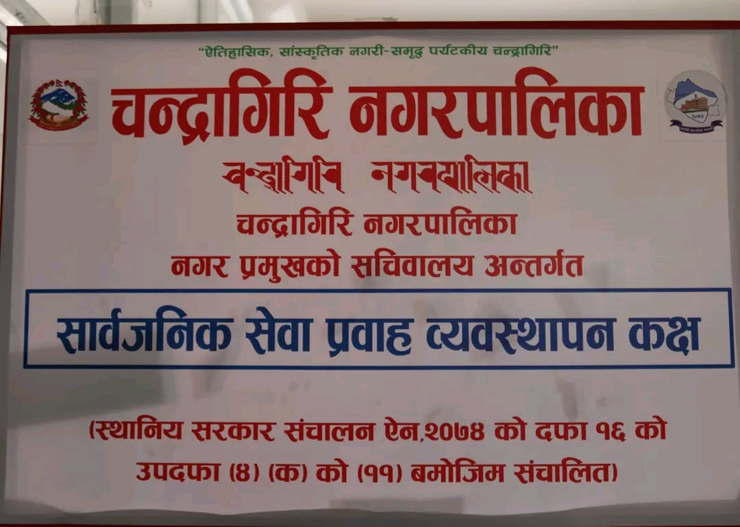 चन्द्रागिरि नगरपालिकाका मेयर घनश्याम गिरीले आफ्नो सचिवालय अन्तर्गतकाे सार्वजनिक सेवा प्रवाह व्यवस्थापन कक्ष थप प्रभावकारी बनाउने घाेषणा गरेका छन् ।
