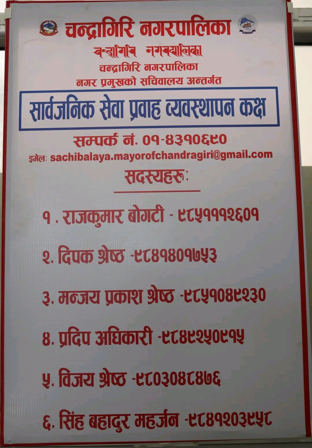 स्थानीय सरकार संचालन ऐन २०७४ को दफा १६ को उपदफा (४)(क) को (११) बमोजिम सञ्चालनमा रहेकाे सचिवालयमा चन्द्रागिरि नगरबासीहरुलाई चन्द्रागिरि नगरपालिकाको कार्यालय, वडा कार्यालयहरु, स्वास्थ्य चौकीहरु, अस्पताल तथा नगरपालिका अन्तर्गतका अन्य कुनै पनि निकायहरुको सेवा प्रवाहमा कुनै पनि किसिमको गुनासो वा सल्लाह वा अन्य कुनै किसिमको जानकारी गराउन पर्ने भएमा प्रत्यक्ष उपस्थित भएर वा टेलिफोन वा ईमेल वा सचिवालयको सामाजिक सञ्जालमार्फत सार्वजनिक सेवा प्रवाह व्यवस्थापन कक्षमा वा सो शाखाका सदस्यहरुसंँग सम्पर्क गर्न नगर प्रमुख घनश्याम गिरीले सार्वजनिक आह्वान गरेका छन् ।