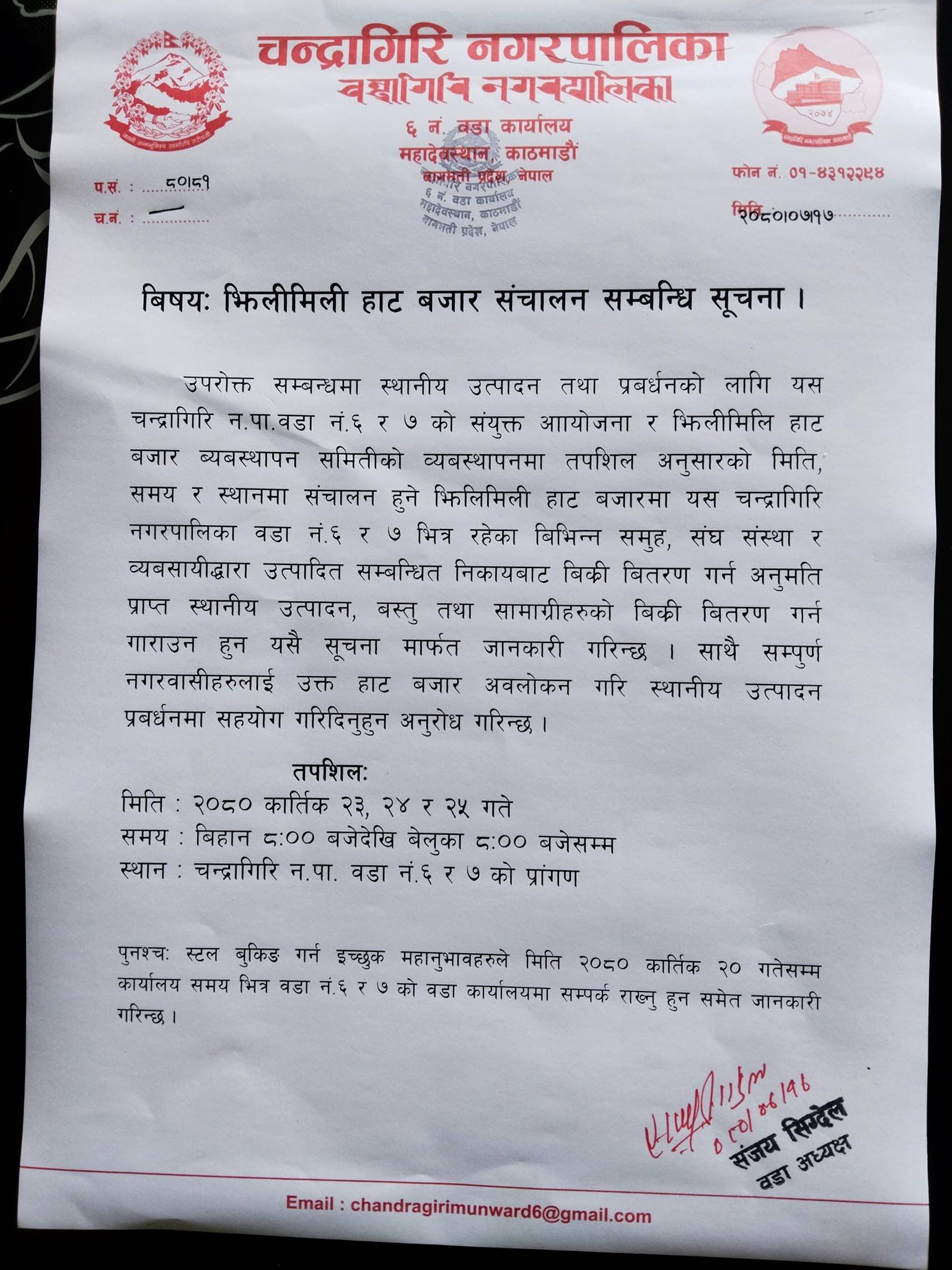 स्थानीय उत्पादनको प्रवर्द्धनका लागि चन्द्रागिरि नगरपालिका ०६ र ०७ ले तीन दिनका लागि संयुक्त रूपमा हाट बजार व्यवस्थापन गर्ने भएका छन् ।