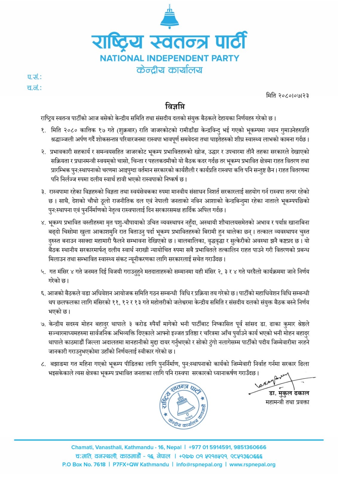 ‘निर्वाचन सकिएको एक वर्ष भएको छ । जनताका सुझाव सुन्न जान लागेका हौं,’ महामन्त्री मुकुल ढकालले भने,‘तपाईहरुसँगै छौ भन्न जान लागेका हौं ।’