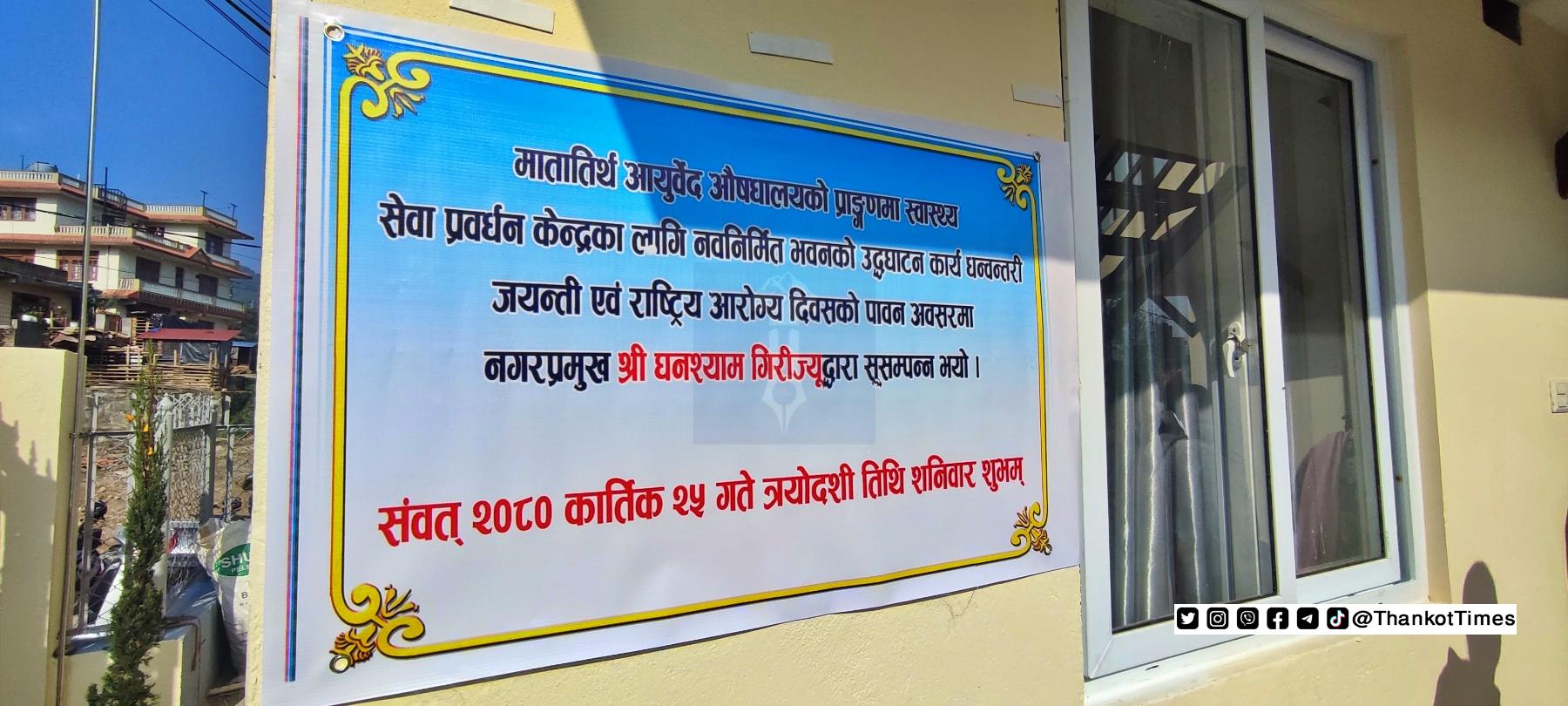 चन्द्रागिरि नगरका मेयर घनश्याम गिरीले आयुर्वेद दिवस एवं धन्वन्तरी जयन्तीका अवसरमा चन्द्रागिरि नगरपालिका-०८ मातातीर्थस्थित आयुर्वेद औषधालय हातामा निर्माण भएको स्वास्थ्य सेवा प्रवर्द्धन केन्द्रको भवन उद्घाटन गरेका छन् ।
