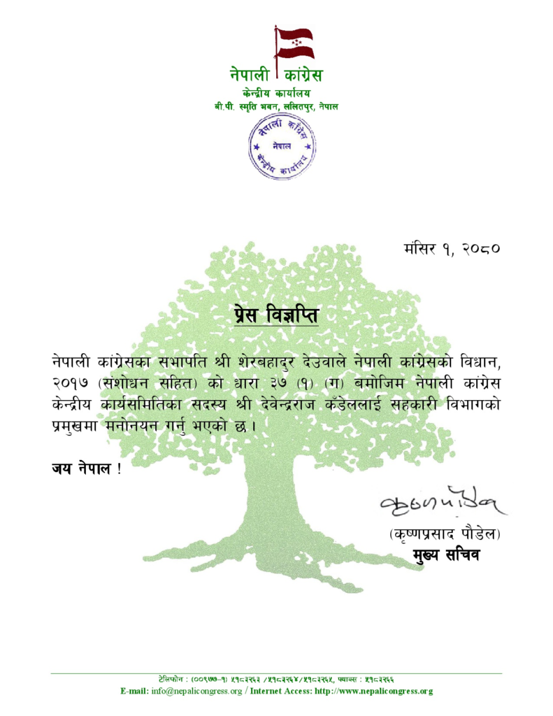 नेपाली कांग्रेसले पार्टीको सहकारी विभाग प्रमुखको जिम्मेवारी देवेन्द्रराज कँडेललाई दिएको छ।