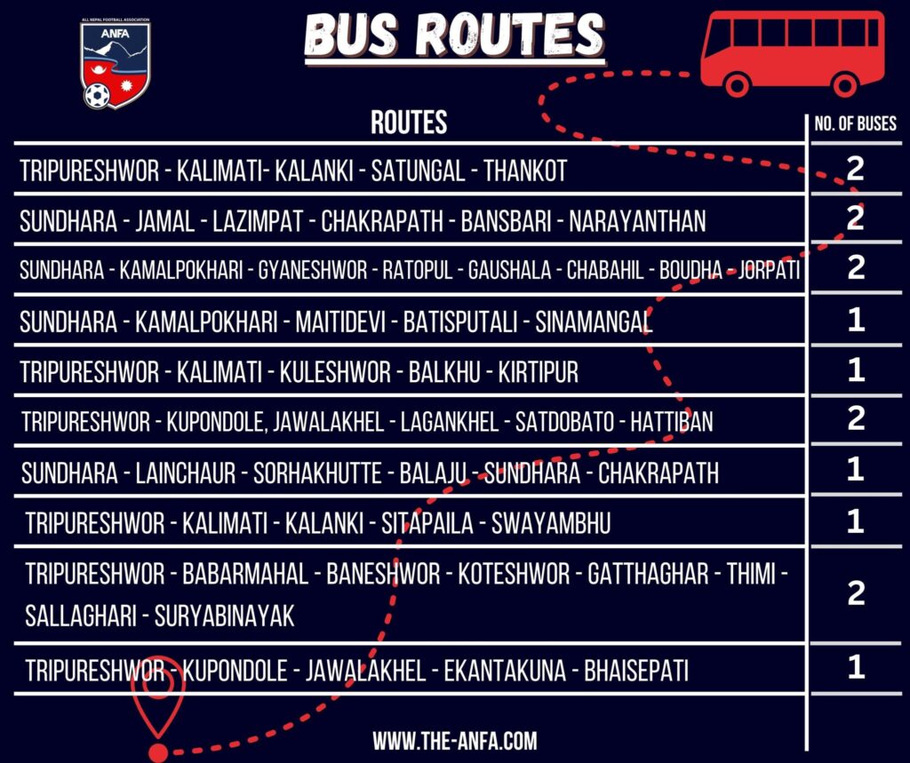 एन्फाले दर्शक घर पुर्याउन व्यवस्था गरेका बसहरू मध्ये २ वटा बस थानकोट रूटमा गुड्ने भएका छन् । एन्फाका अनुसार त्रिपुरेश्वरबाट छुट्ने ती बस कालिमाटी-कलंकी-सतुगंल-थानकोट रूटमा गुड्नेछन् ।