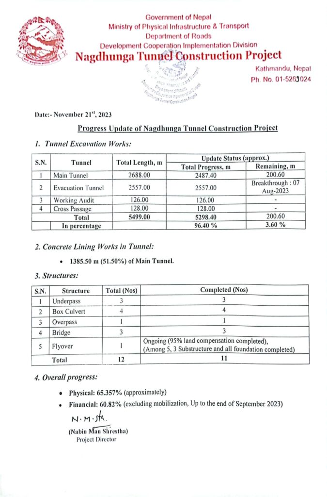 आयोजनाका निर्देशक नवीनमान श्रेष्ठका अनुसार यस आयोजनाको रेस्क्यू टनेलको भने ‘ब्रेक थ्रु’ भइसकेको छ । यहाँ २ हजार ५५७ मिटर लामो रेस्क्यू टनेल रहेको छ । जसको ७ अगष्ट २०२३ का दिन ‘ब्रेक थ्रु’ भएको हो । टनेलको कुल भौतिक प्रगति ९६.४० प्रतिशत पुगेको छ । अब ३.६० प्रतिशत मात्र भौतिक प्रगति बाँकी रहेको आयोजनाले जनाएको छ ।