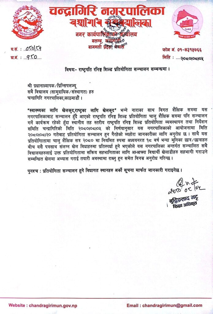 चन्द्रागिरि नगरपालिकामा मंसिर २० गतेबाट राष्ट्रपति रनिङ्ग शिल्ड खेलकुद प्रतियोगिता सञ्चालन हुने भएको छ ।