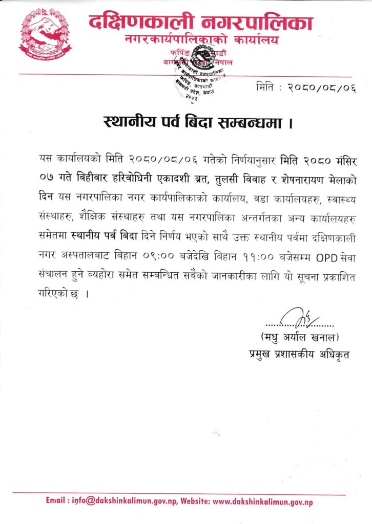 बुधबार एक सूचना जारी गर्दै नगरले बिहीबार हरिबोधनी एकादशी व्रत, तुलसी विवाह तथा शेषनारायण मेलाको अवसरमा नगर क्षेत्रमा स्थानीय बिदाको जानकारी गराएको हो ।