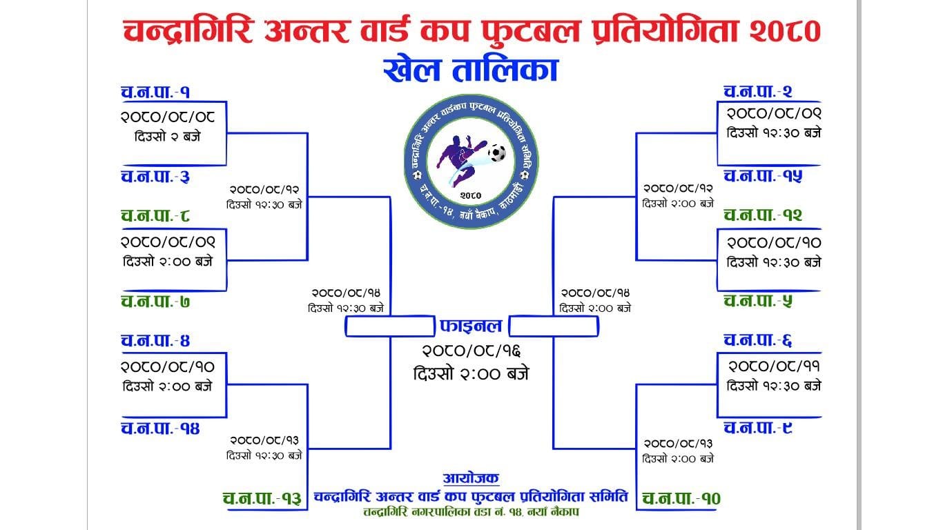 गत बुधबार चन्द्रागिरि नगरपालिका-१४ नयाँ नैकापको कार्यालयमा सार्वजनिक गरिएको खेल तालिका अनुसार सहभागी १४ वडाहरू मध्ये वडा नं. १ र ३ पहिलो खेलमा आमुने सामुने हुने भएका हुन् ।